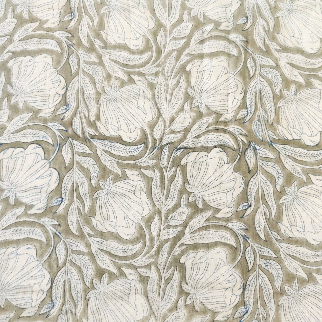 Pre-cut 1.90 meter Pure Cotton Pastel Grey With Wild Flower Jaal Hand Block Print Fabric