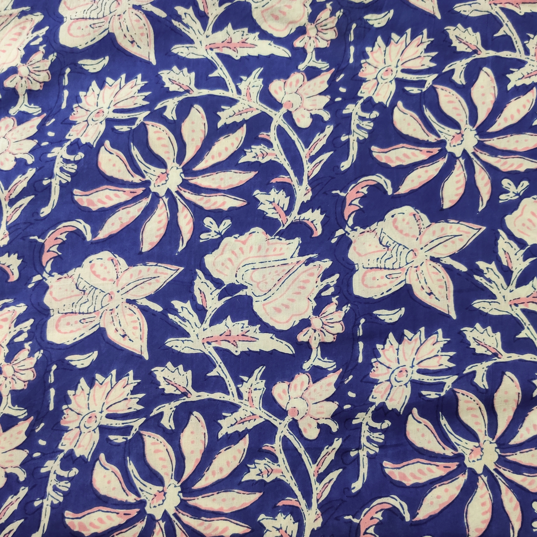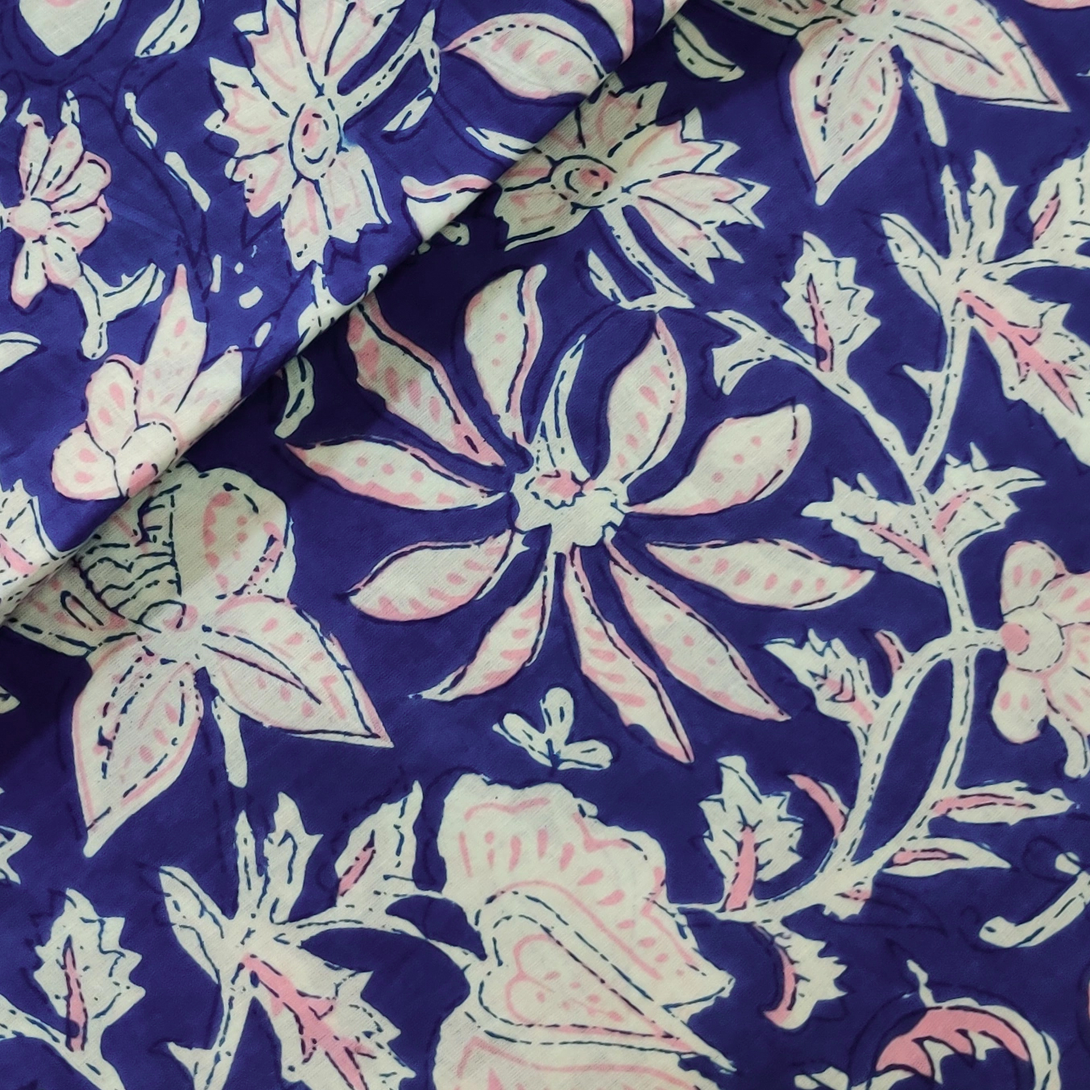 Pre-cut (1.95 meter) Pure Cotton Jaipuri Blue With Pink And White Wild Flower Jaal Hand Block Print Fabric