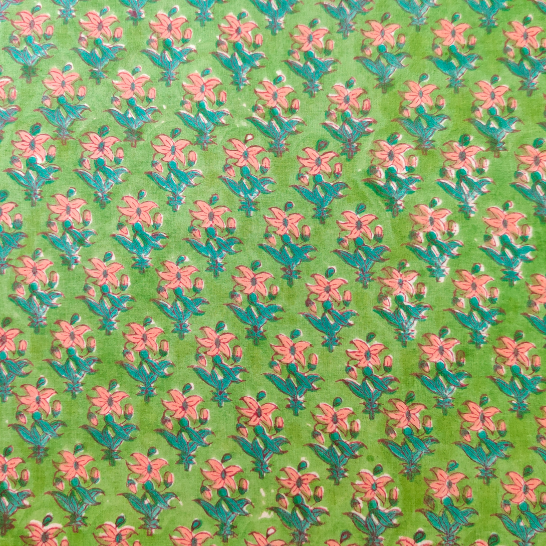 Pre-cut 1.95 meter Pure Cotton Jaipuri Green With Pink Tiny Flower Motifs Hand Block Print Fabric