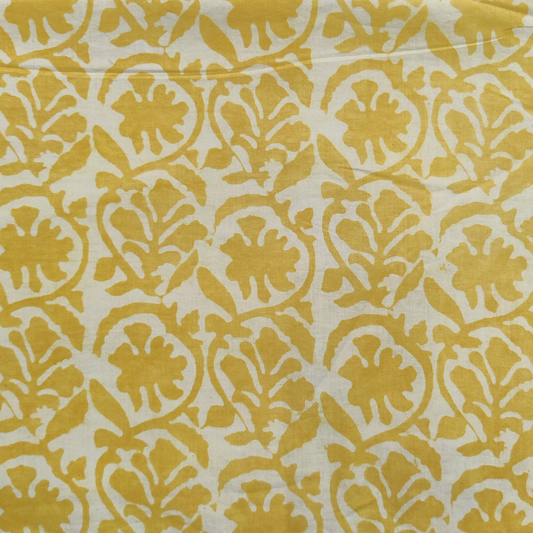 Pre-Cut 1.95 Meters Pure Cotton Dabu Light Mustard With Yellow Creeper Jaal Hand Block Print Fabric