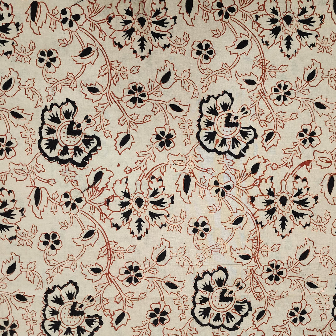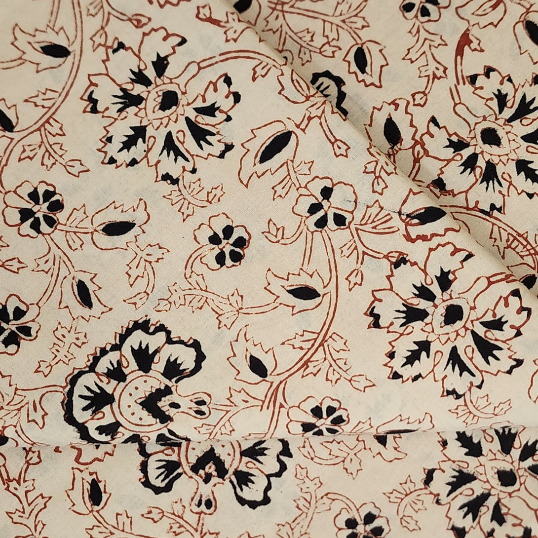 ( Pre-Cut 1 Meter ) Pure Cotton Bagru Cream With Black And Rust Jaal Hand Block Print Fabric