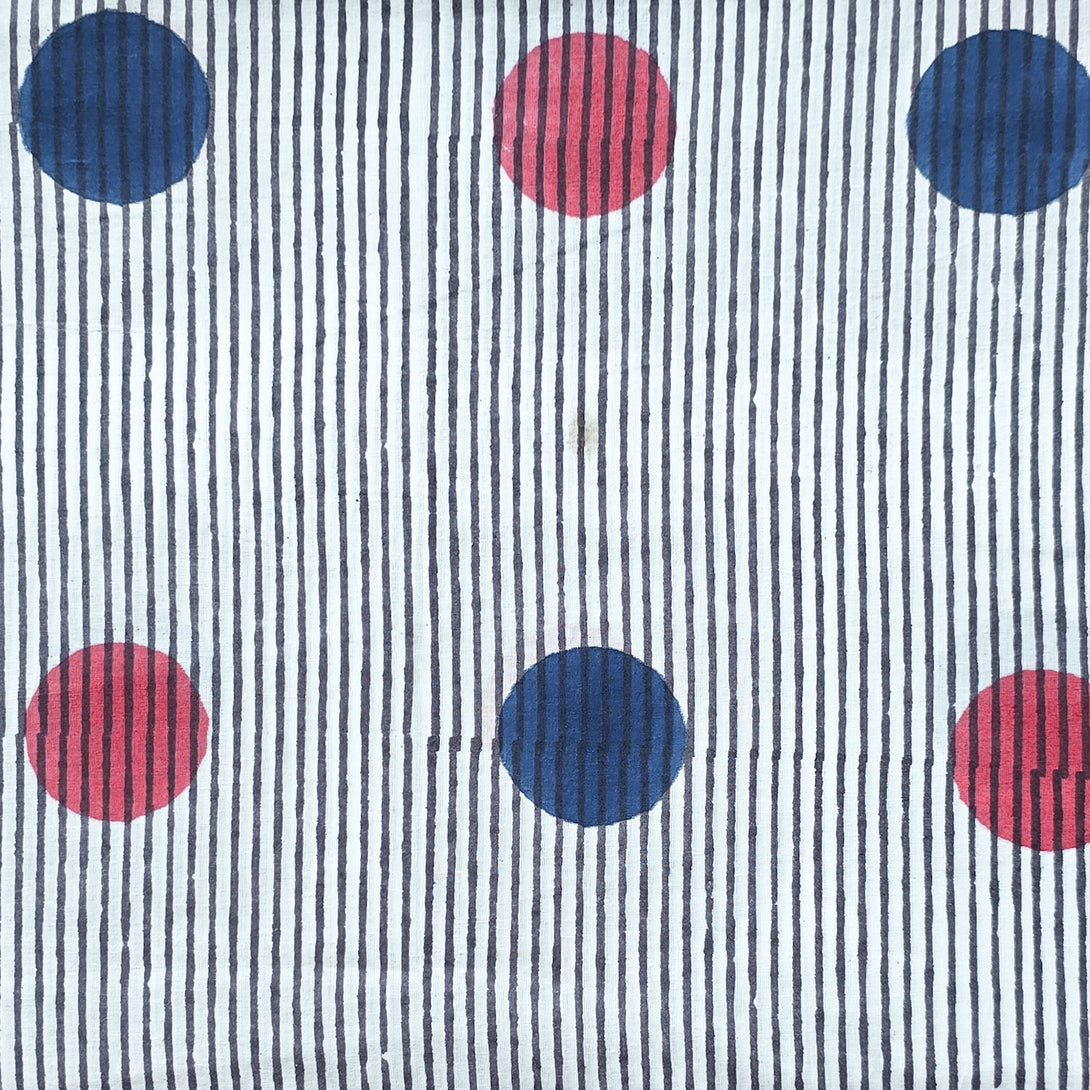 (PRE-CUT 1 METER) Pure Cotton Jaipuri White With Red And Blue Stripes With Polka Dotes Hand Block Print Fabric