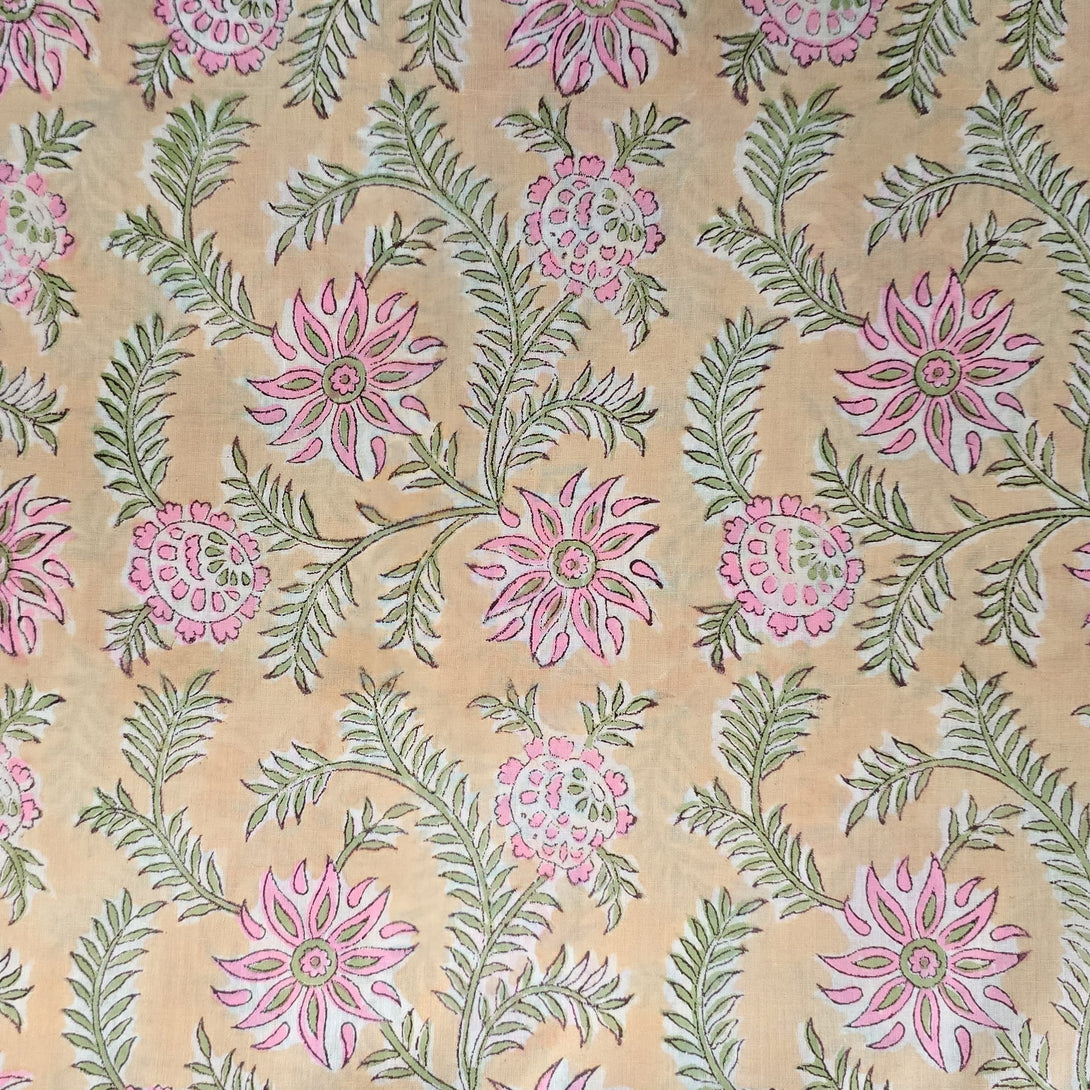 (Pre-cut 1 meter)Pure Cotton Jaipuri Light Peach With Light Pink Flower Creeper Hand Block Print Fabric