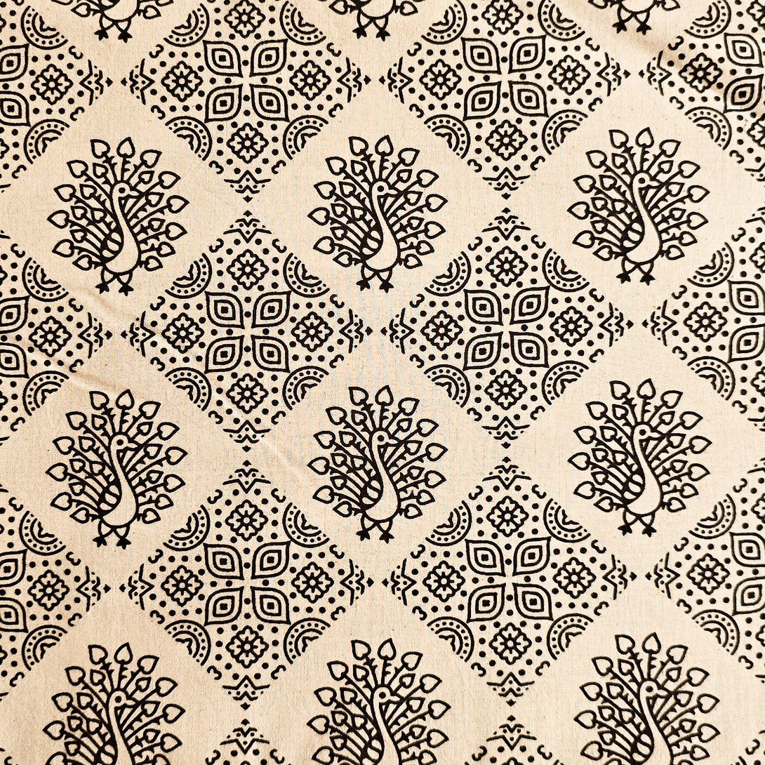 (PRE-CUT 2.10 METER)Pure Cotton Ajrak Vegetable Dyed Cream And Black Peacock With Intericate Design Hand Block Print Fabric