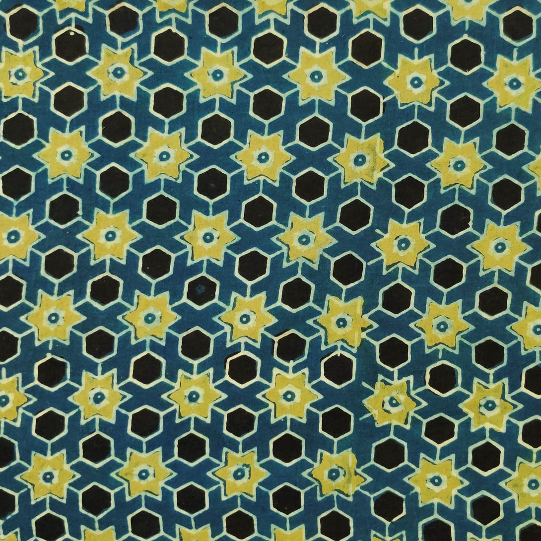 Pre Cut 2.20 Meter Pure Cotton Blue Ajrak With Green Black Hexa Star Tile Hand Block Print Fabric