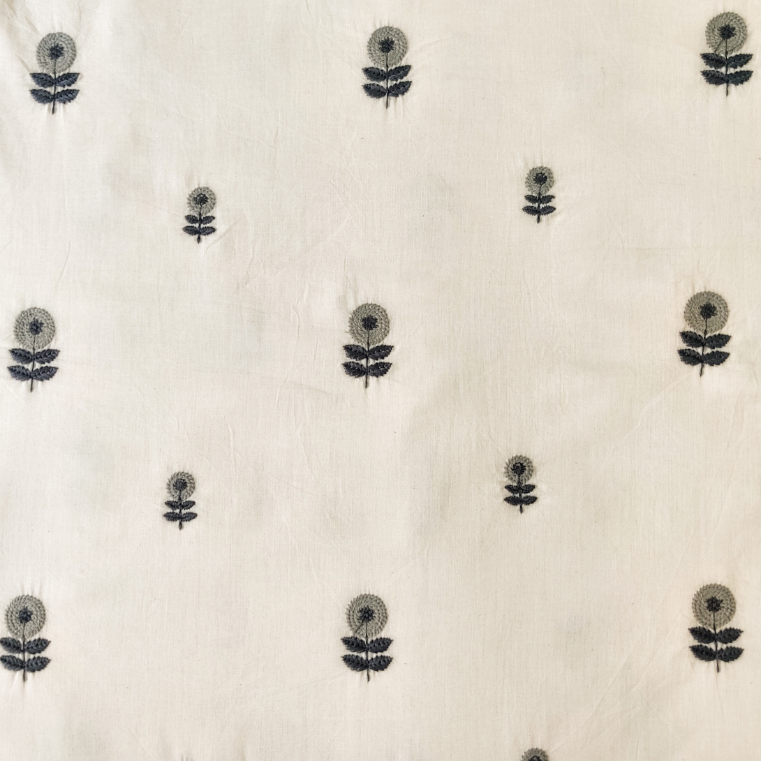 Pre-cut ( 2.20 meter )Pure Cotton Cream With Tiny Grey Flower Embroiedered Fabric