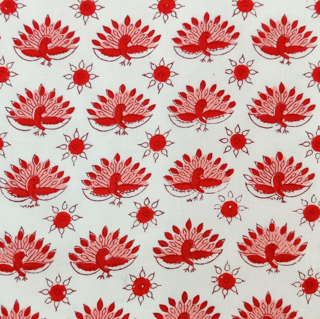 Pre-cut 2.35 meter Pure Cotton Jaipuri White With Peach Red Dancing Peacock Hand Block Print Fabric