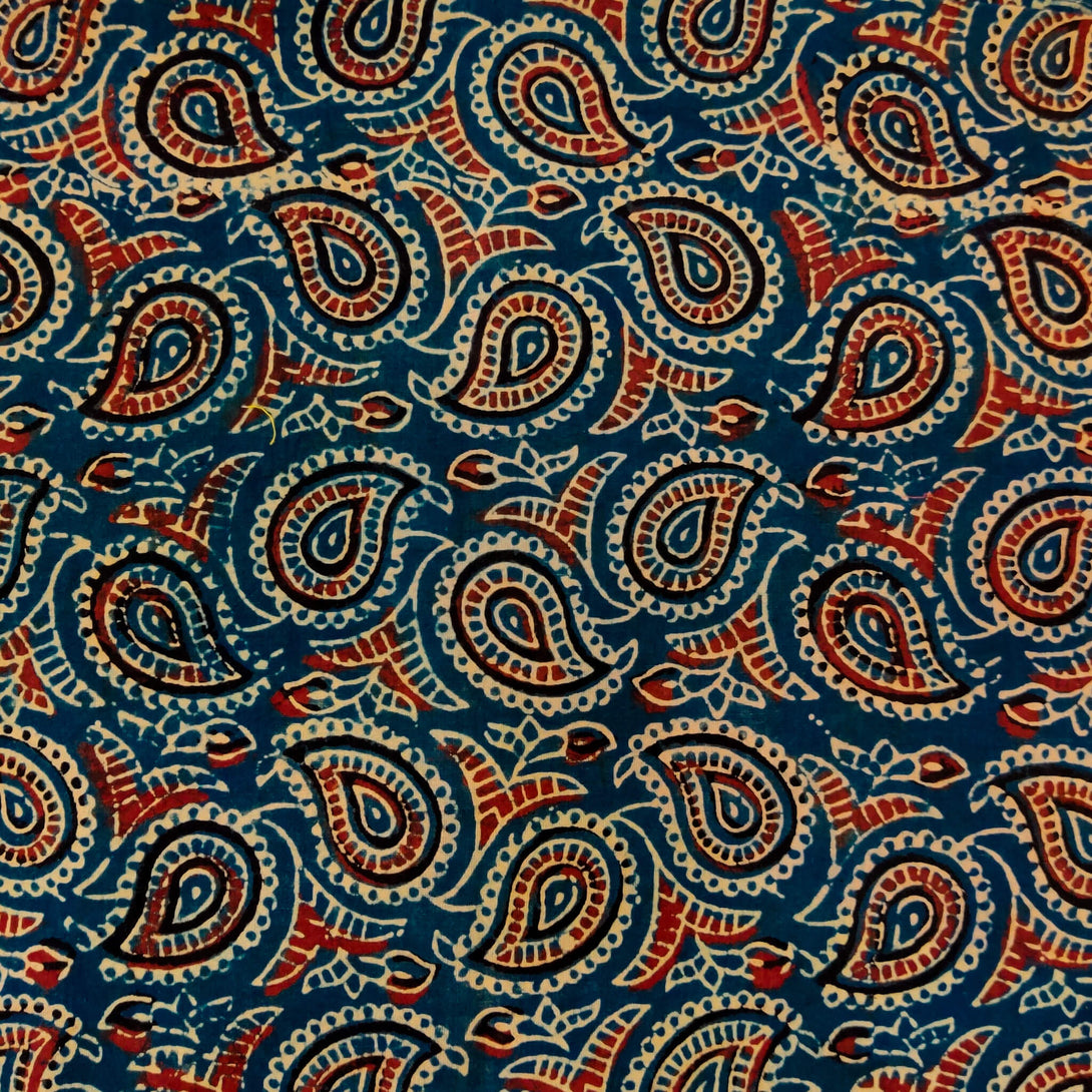Pre-cut 2.5 Meter Pure Cotton Ajrak Persian Ble With Kairi Jaal Hand Block Print Fabric