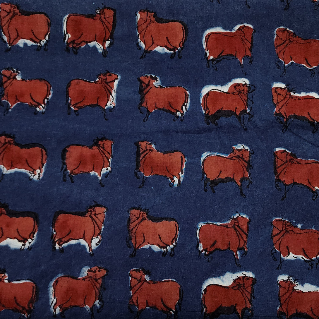 PRE-CUT 2 METER Pure Cotton Indigo With Rust Red Moo Hand Block Print Fabric
