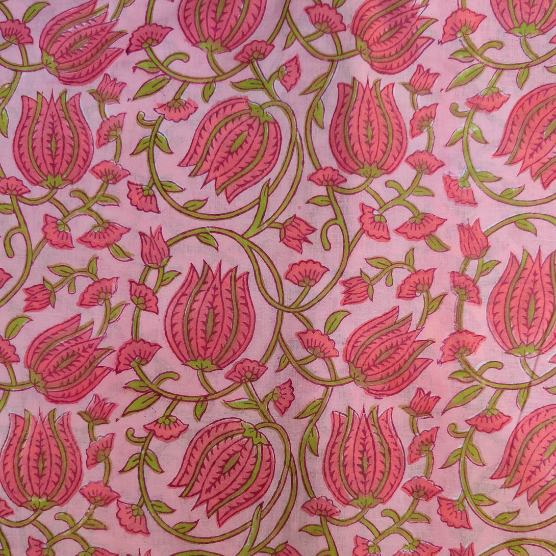 Pre-cut ( 2 meter) Pure Cotton Jaipuri Pink With Lotus Jaal Hand Block Print Fabric