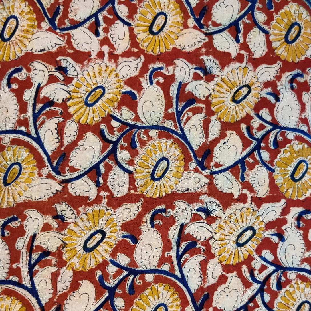 ( Pre-Cut 2 Meter ) Pure Cotton Kalamkari Rust With Mustard And Blue Floral Jaal Hand Block Print Fabric