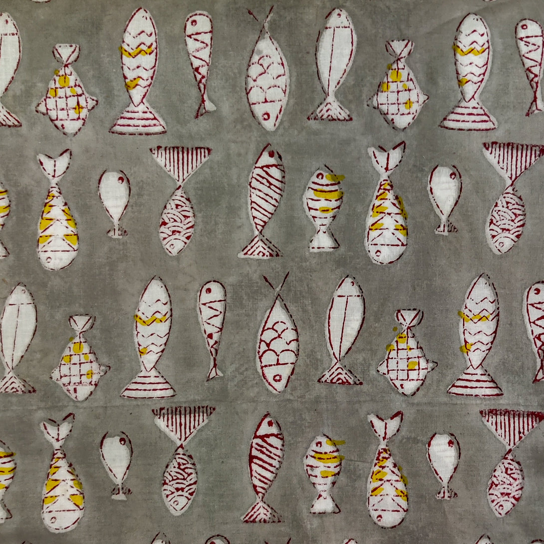 Pre-Cut (2 Meter) Pure Cotton Organic Dyed Grey With Cream Yellow Fish Hand Block Print Fabric
