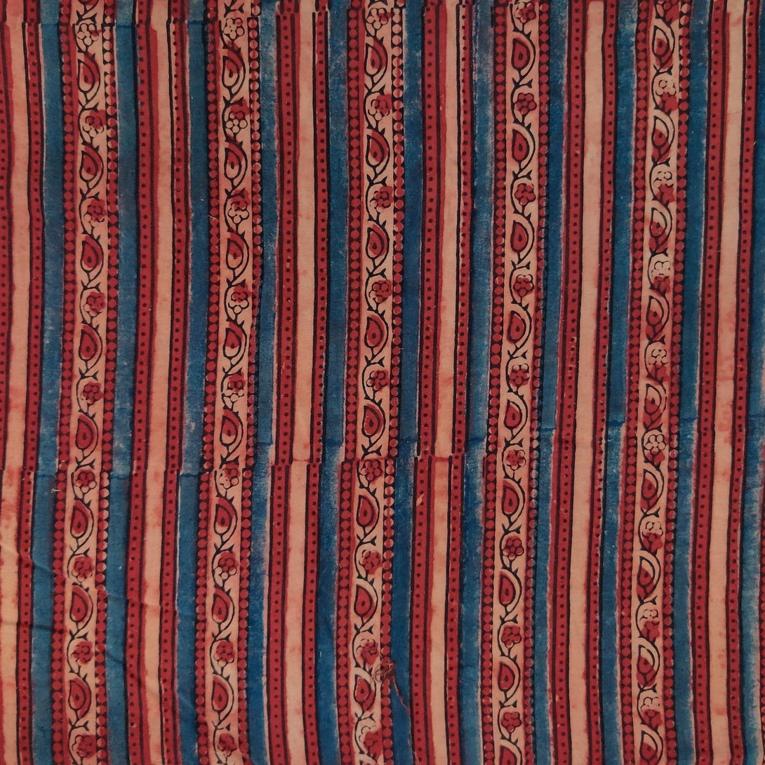 Pre-Cut 2 Meters Pure Cotton Special Ajrak Maroon Blue Cream Kairi Stripes Hand Block Print Fabric