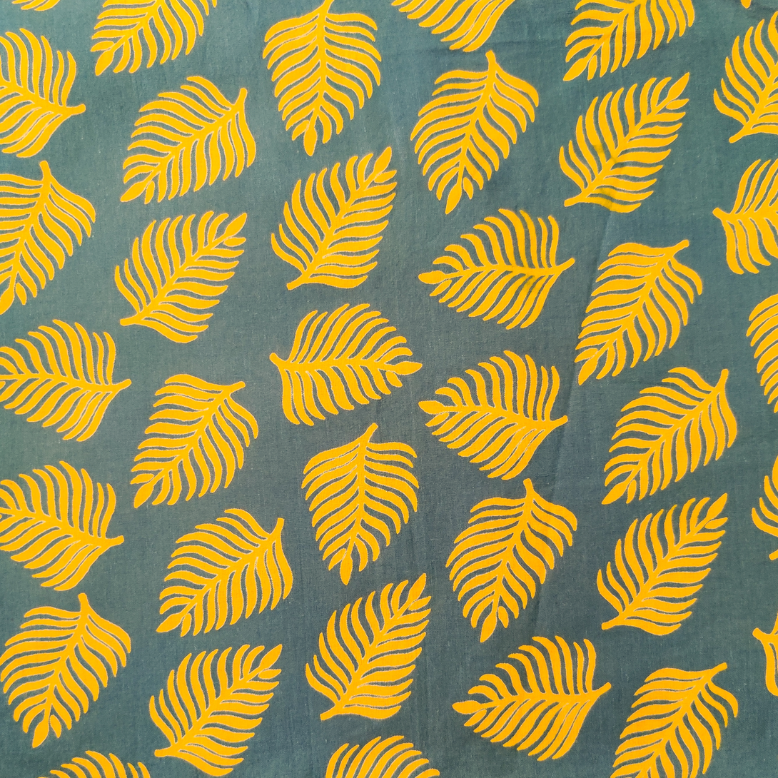Pre-cut Pure Cotton Discharge Dabu Grey With Yellow Fern Leaf Block Hand Block Print Fabric( 2.35 meter)