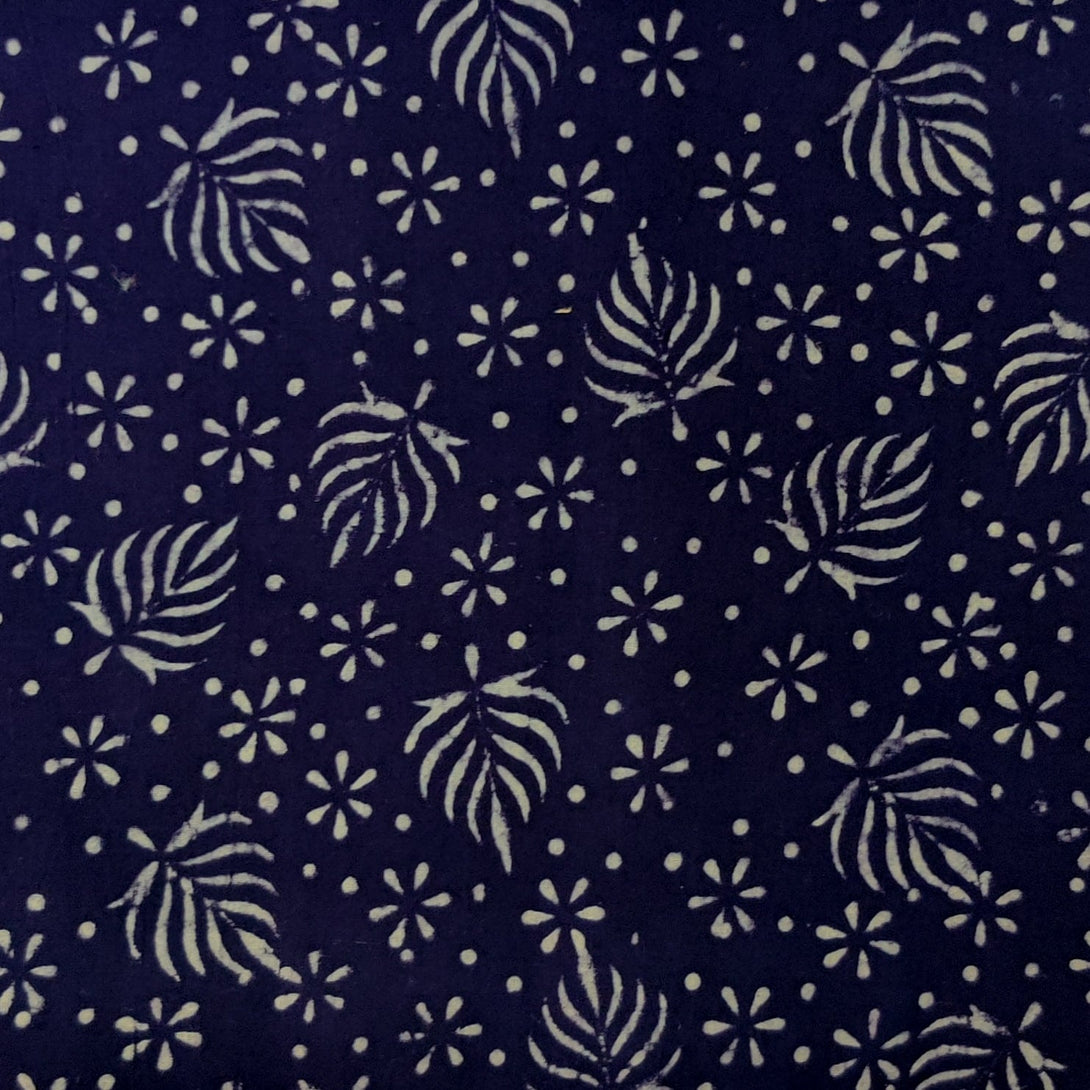 pre-cut Pure Cotton Gamthi Navy Blue With White Leaves And Flowers Motifs Hand Block Print Fabric( 1.60 meter)