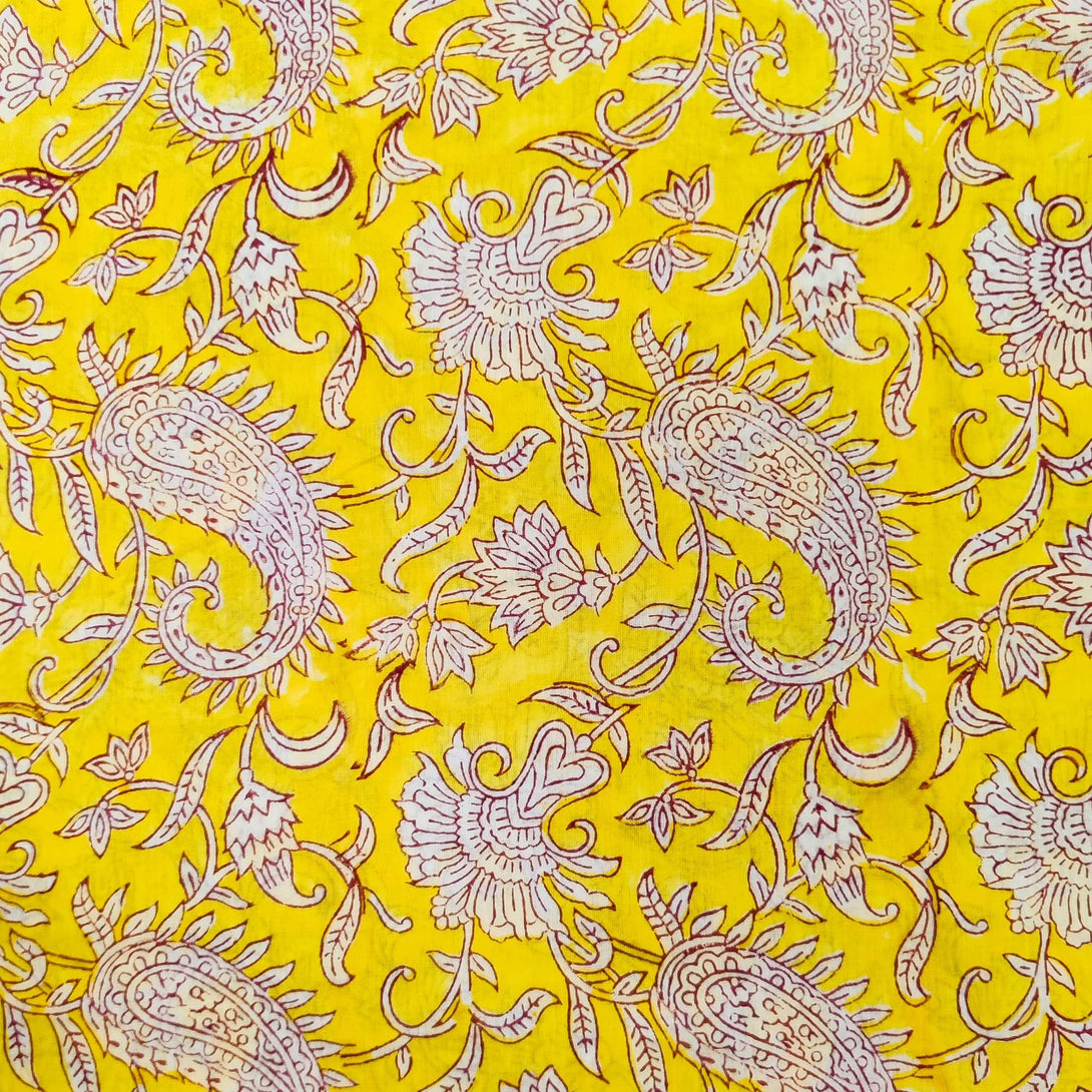 pre-cut Pure Cotton Jaipuri Yellow With Kairi Jaal Hand Block Print Fabric(2 meter)