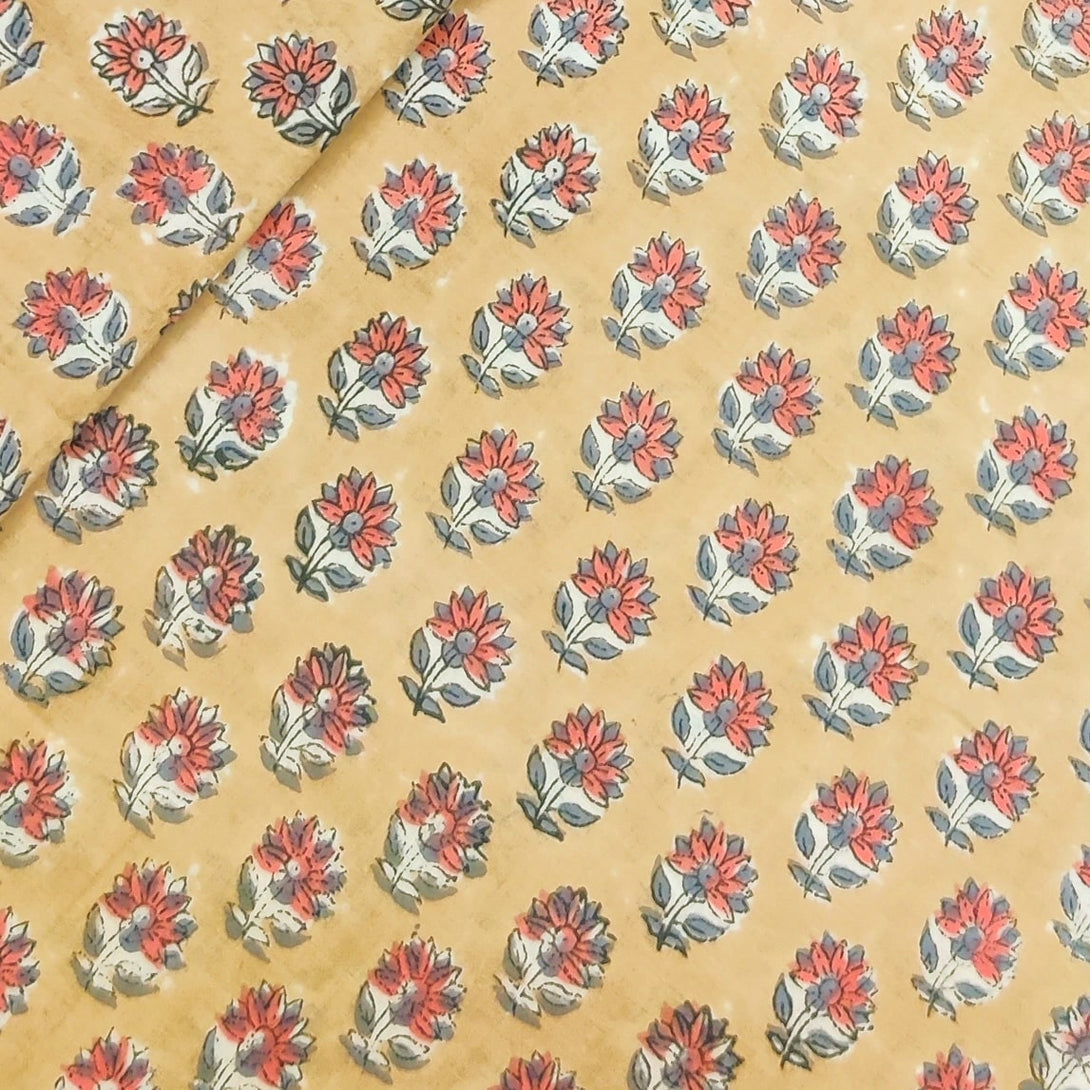 Precut ( 1.65 Meter ) Pure Cotton Jaipuri Light Brown With Tiny All Over Flower Motifs Hand Block Print Fabric
