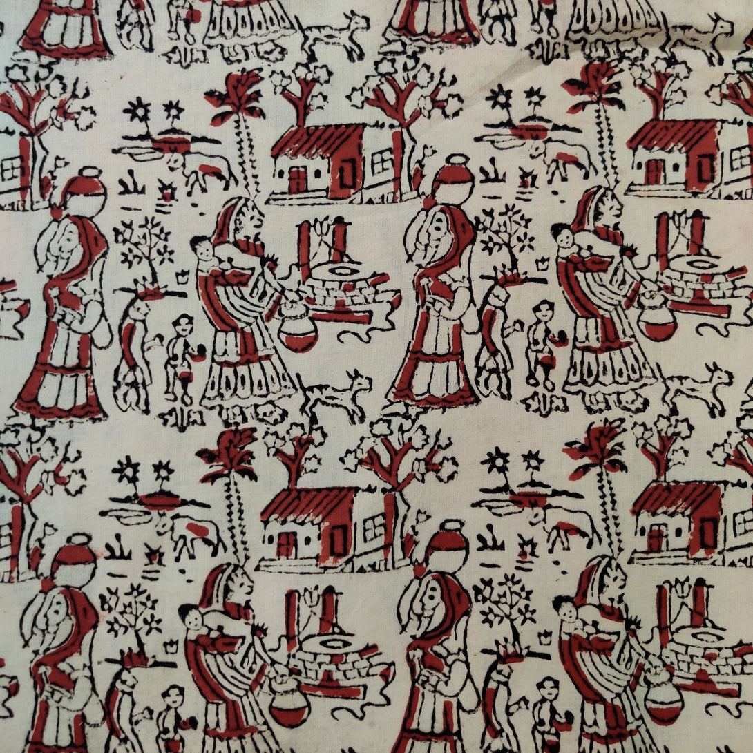 Precut ( 2 Meter ) Pure Cotton Dabu Bagru Jahota Cream With Village Women Hand Block Print Fabric