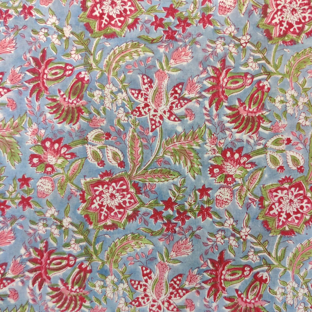 Precut ( 2 Meter ) Pure Cotton Jaipuri Blue With Shades Of Pink Peach Jaal Hand Block Print Fabric