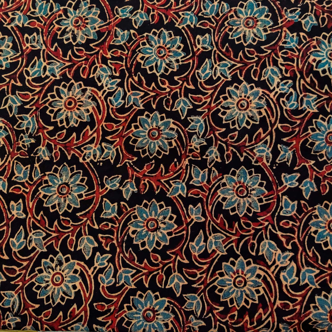 Prre-cut ( 1.60 )Pure Cotton Ajrak Black With Light Blue Daisy Jaal Hand Block Print Fabric