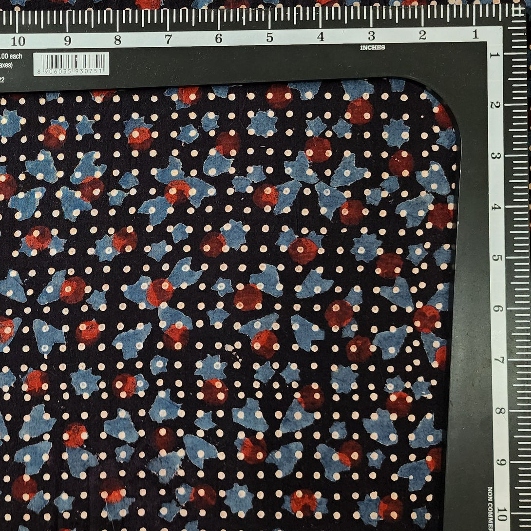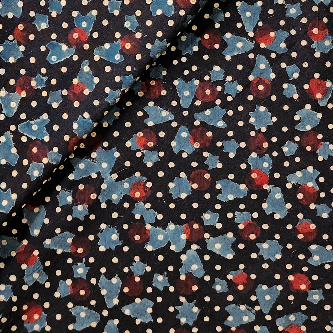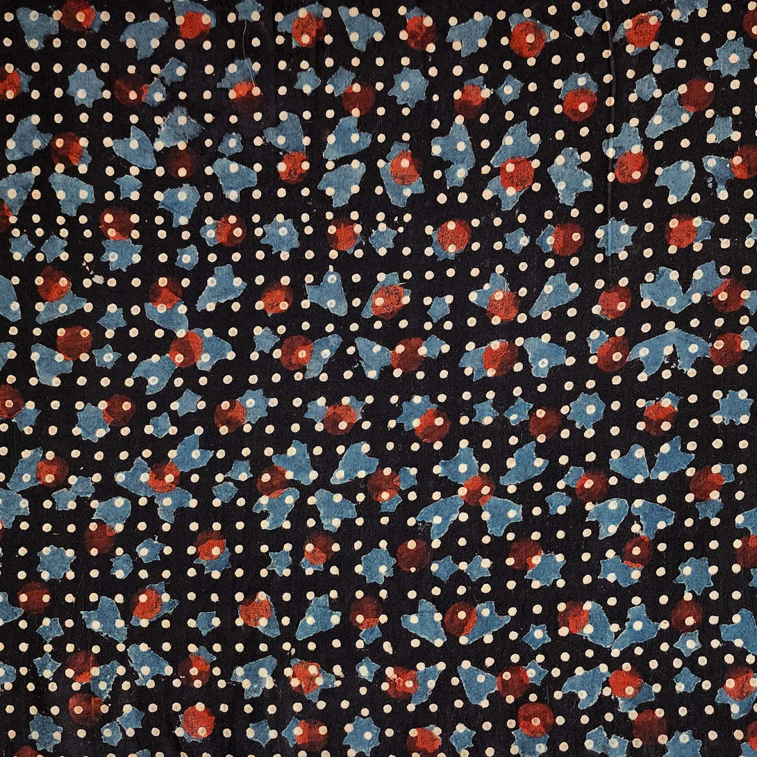Pure Cotton Ajrak Black With Blue And Red Intricate Design Hand Block Print Fabric