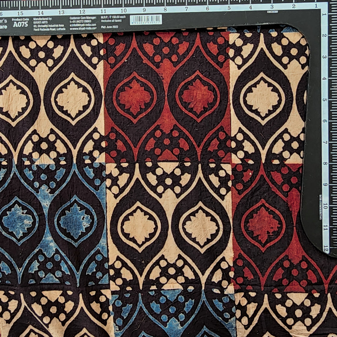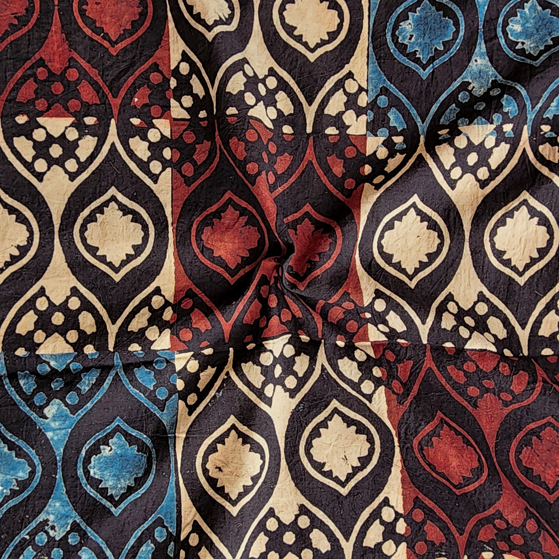 Pure Cotton Ajrak Black With Blue And Red Intricate Design Tile Hand Block Print Fabric