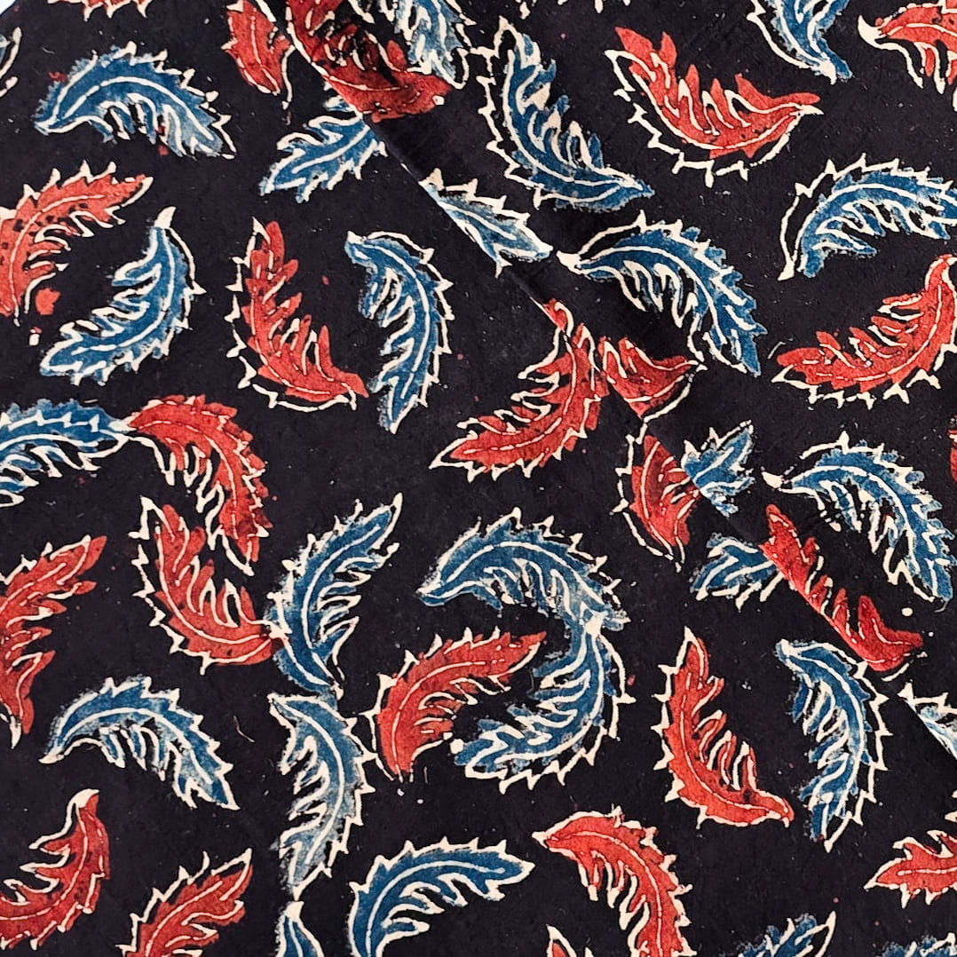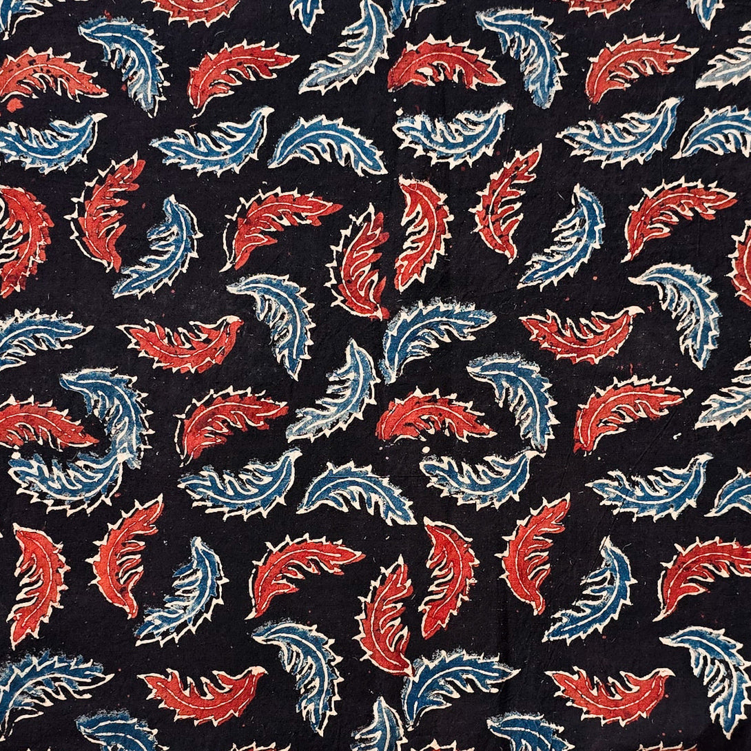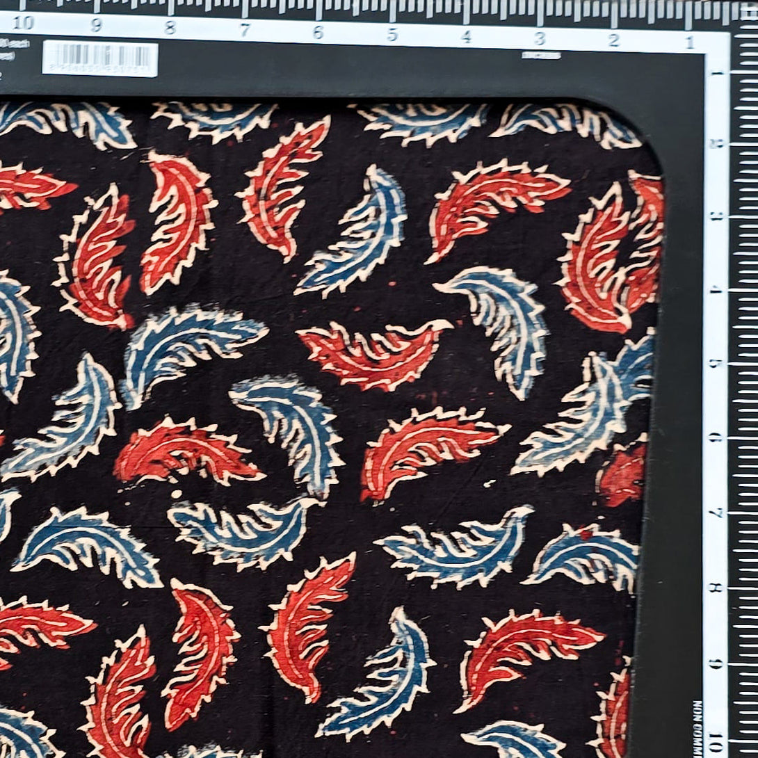 Pure Cotton Ajrak Black With Blue And Red Leaves Motif Hand Block Print Fabric