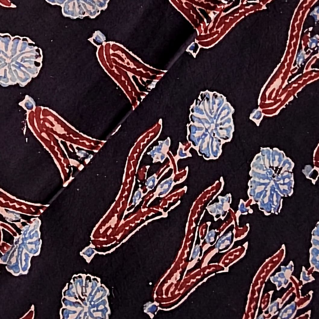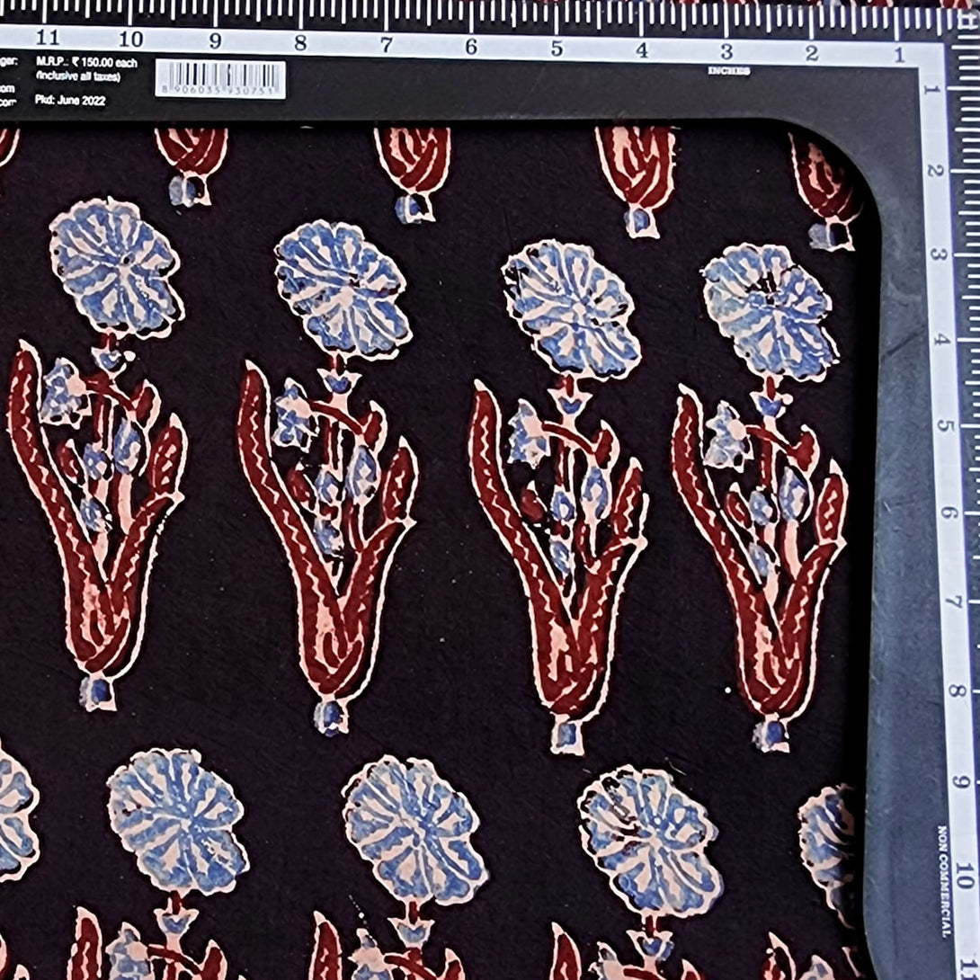 Pure Cotton Ajrak Black With Blue Big Flower Motif Design Hand Block Print Fabric