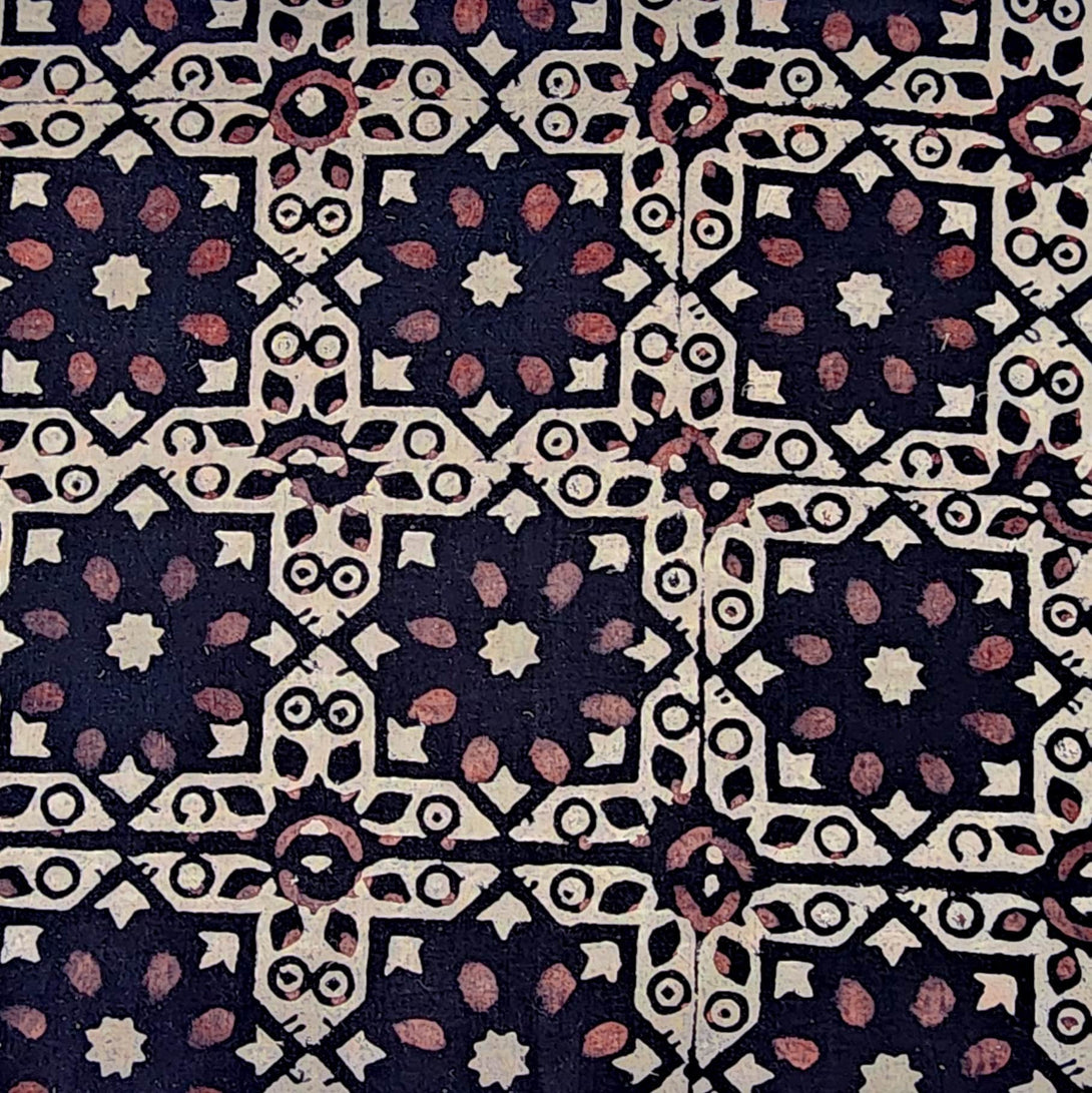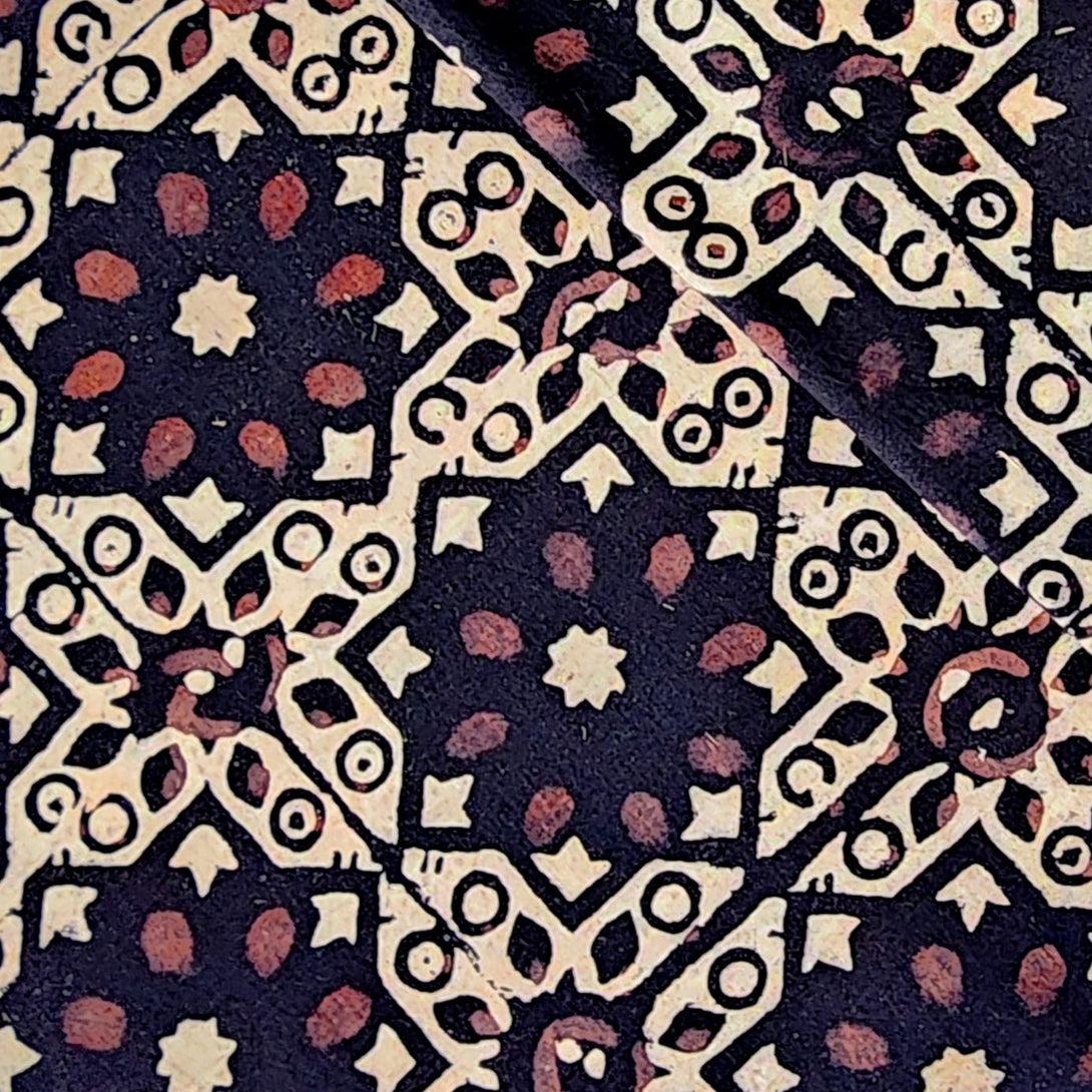 Pure Cotton Ajrak Black With Cream And Maroon Star Intricate Design Hand Block Print Fabric