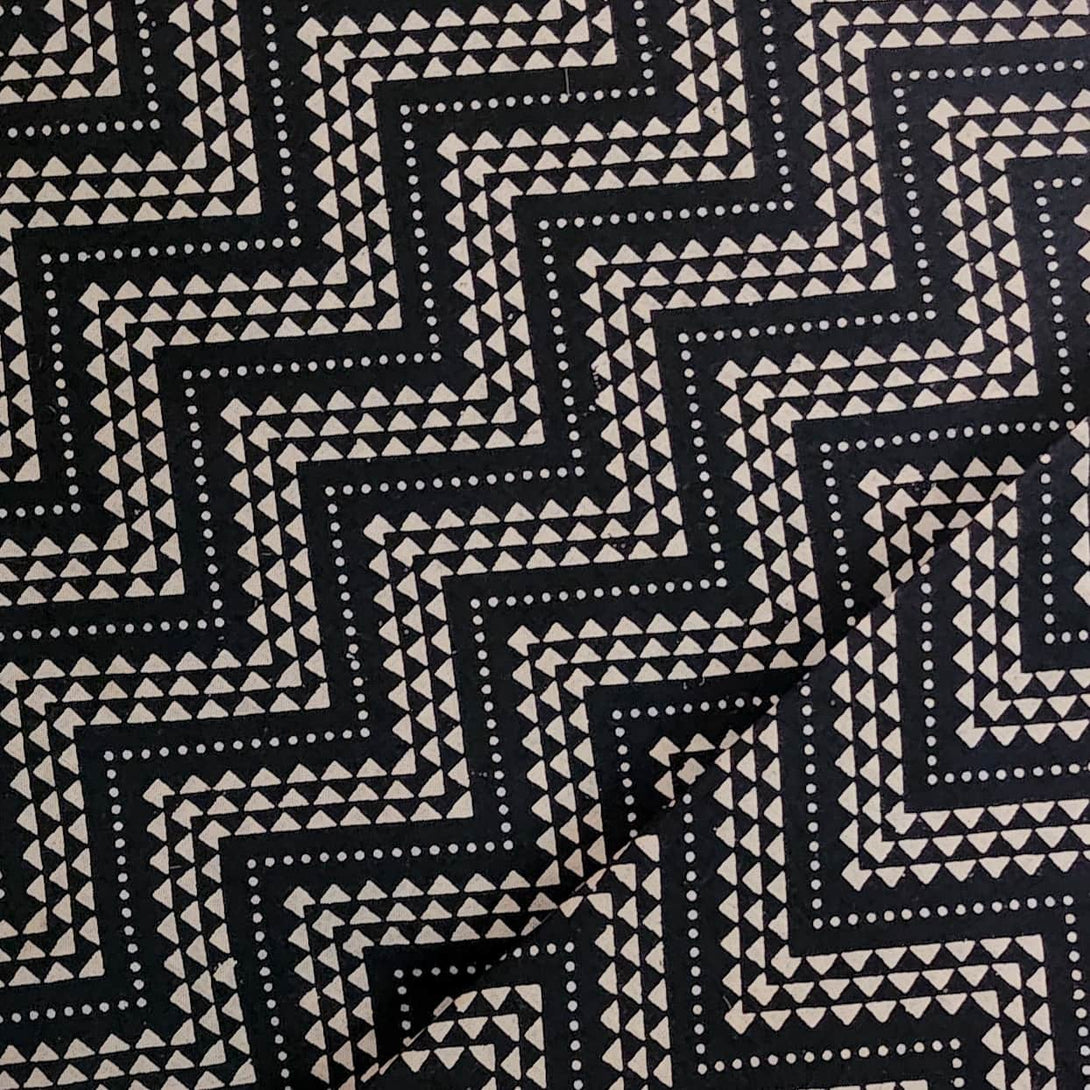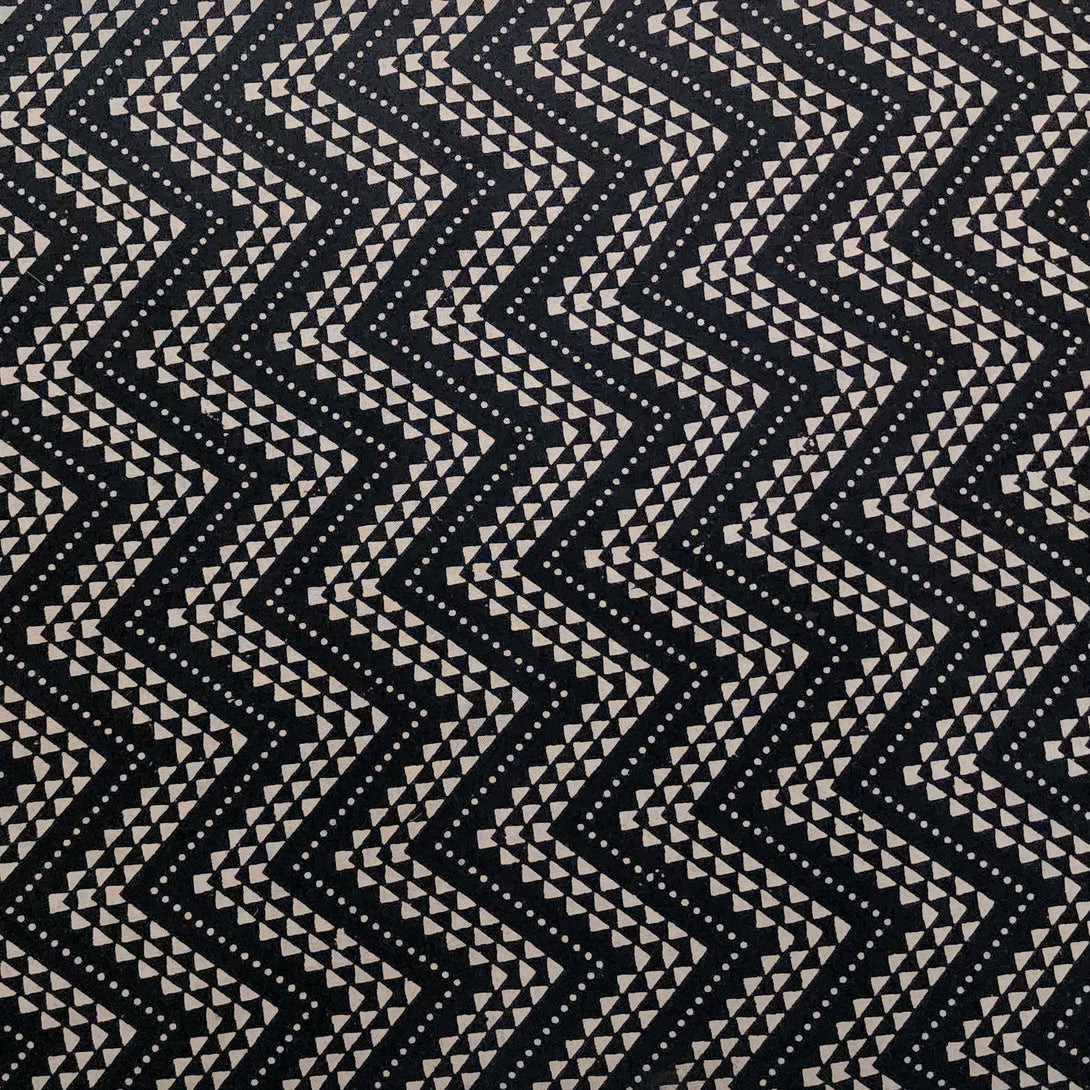Pure Cotton Ajrak Black With Cream Zig Zag Hand Block Print Fabric
