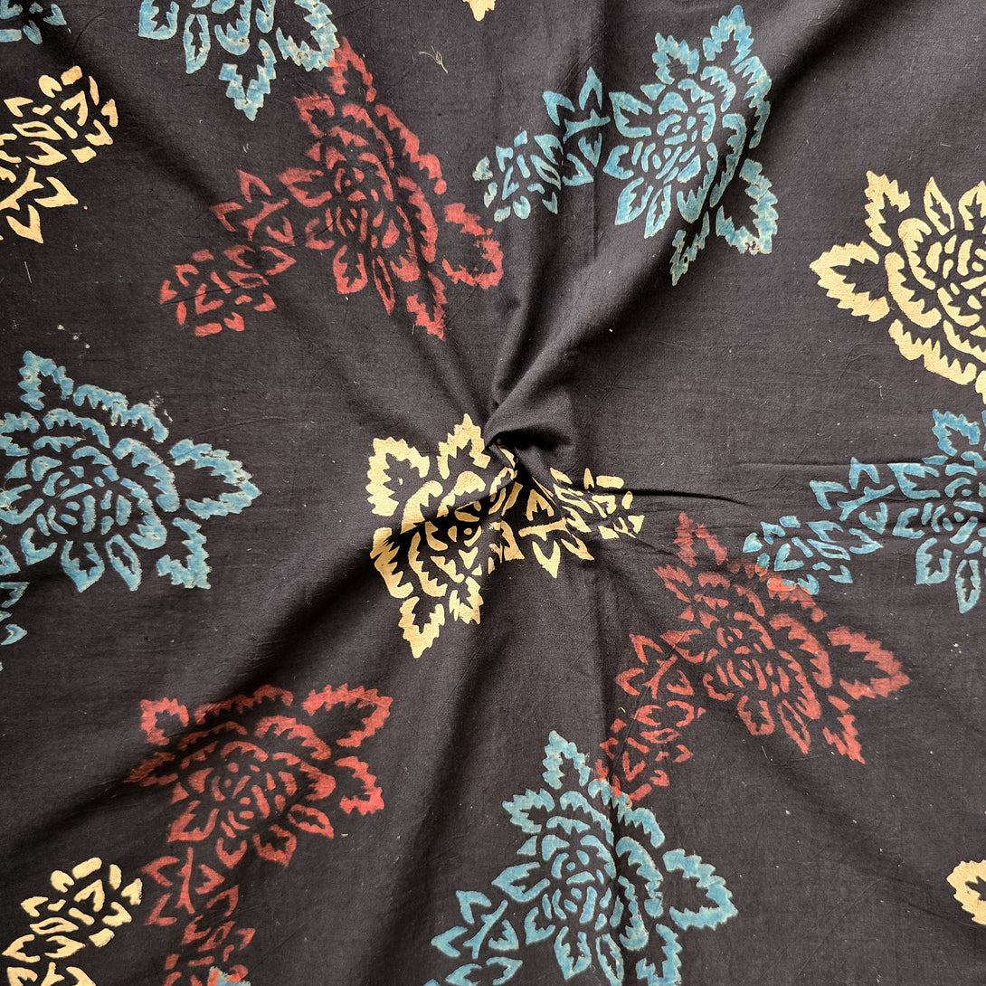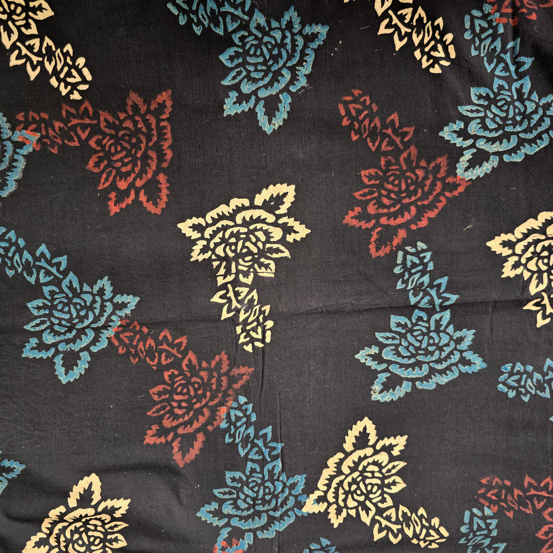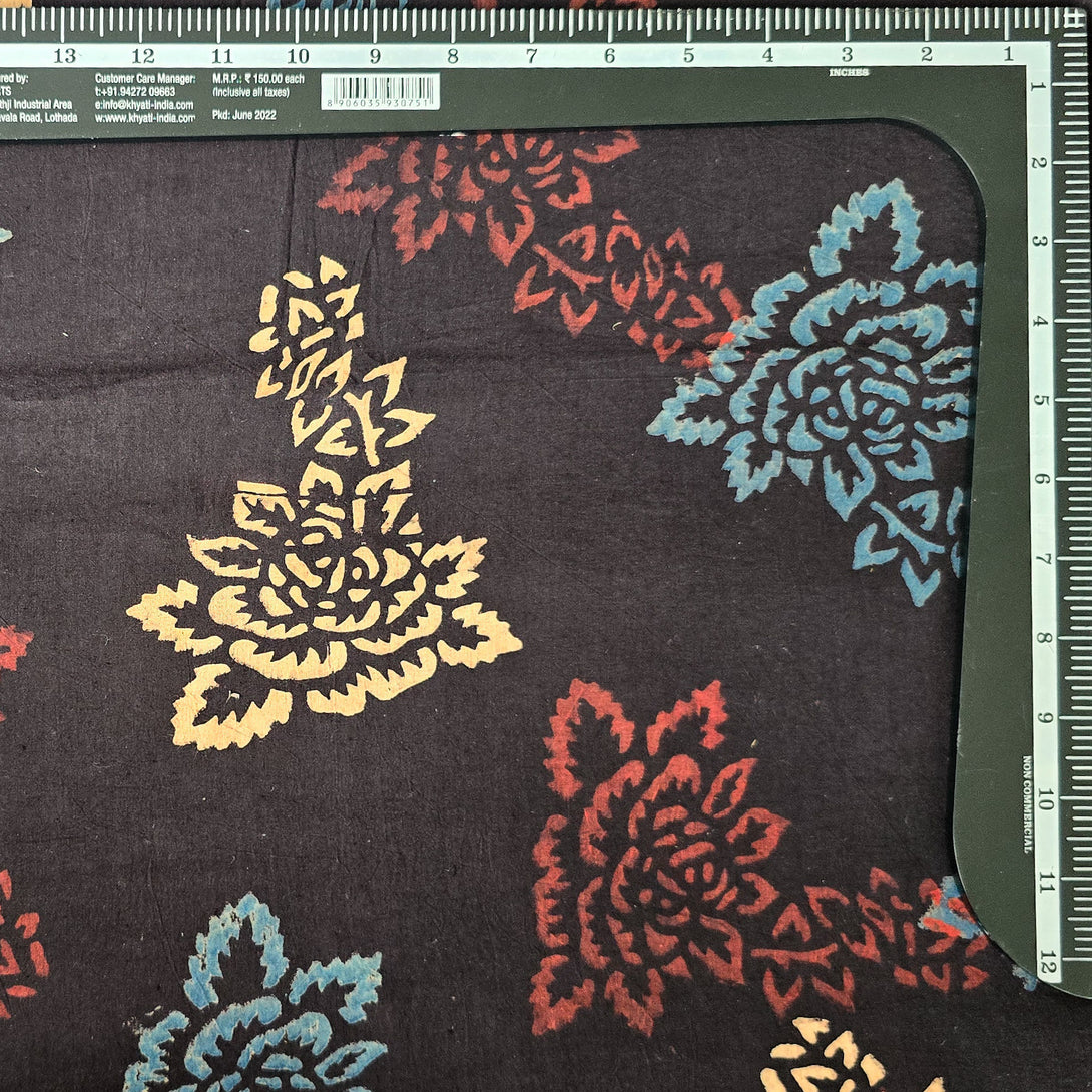 Pure Cotton Ajrak Black With Red And Blue And Cream Flower Design Hand Block Print Fabric