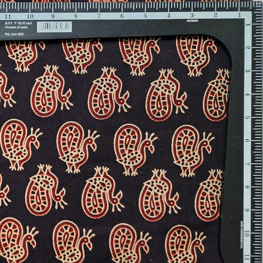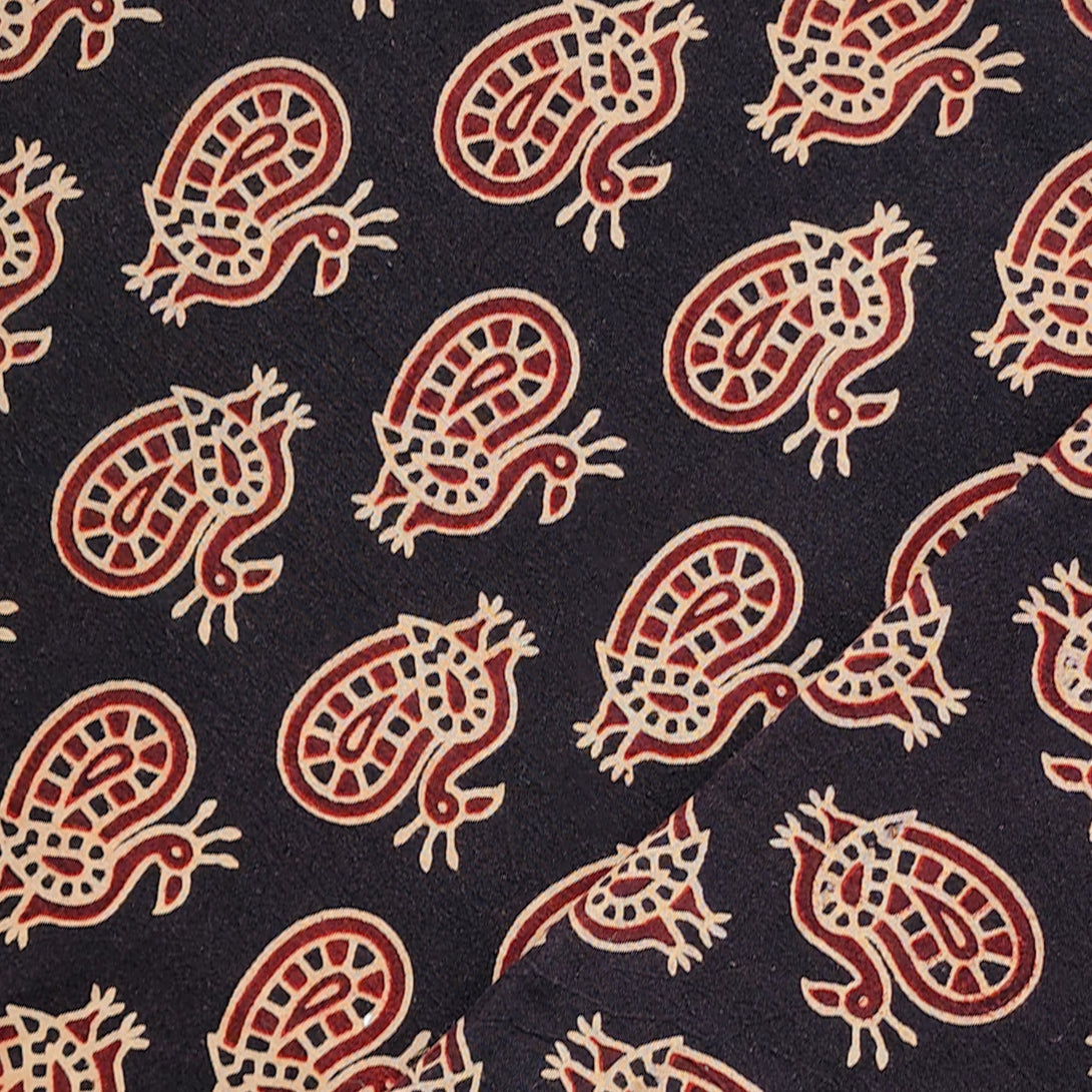 Pure Cotton Ajrak Black With Maroon Bird Motif Hand Block Print Fabric