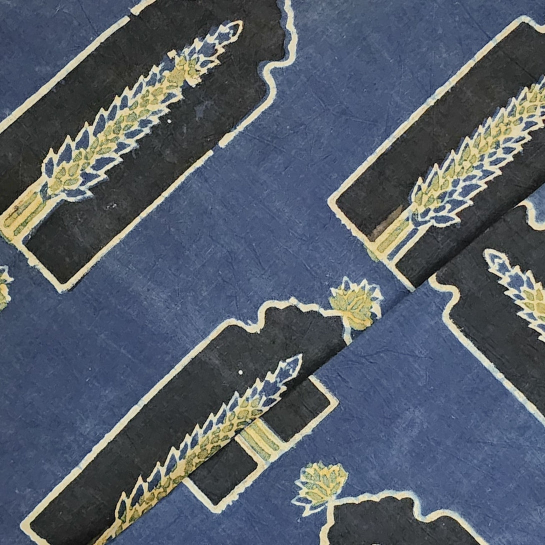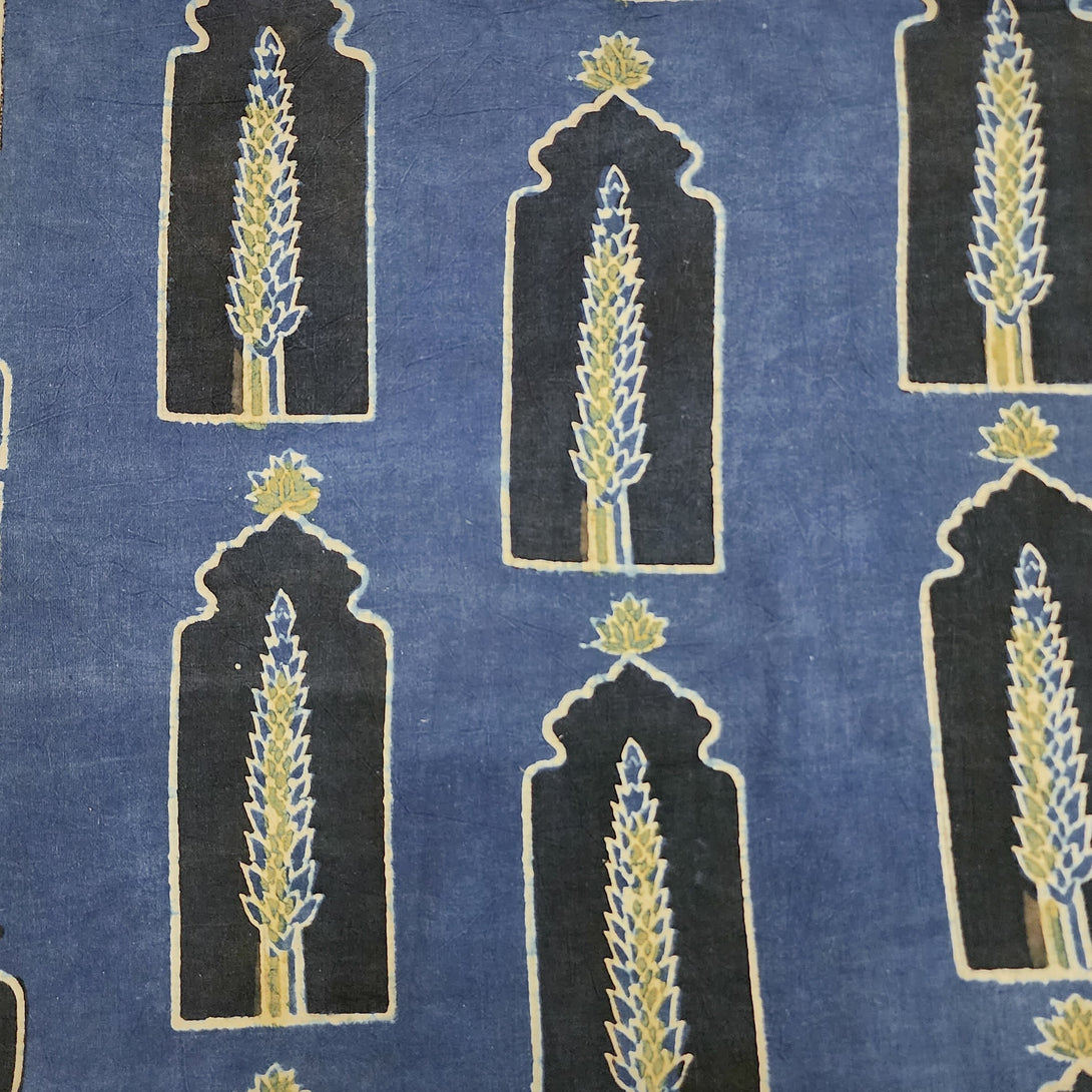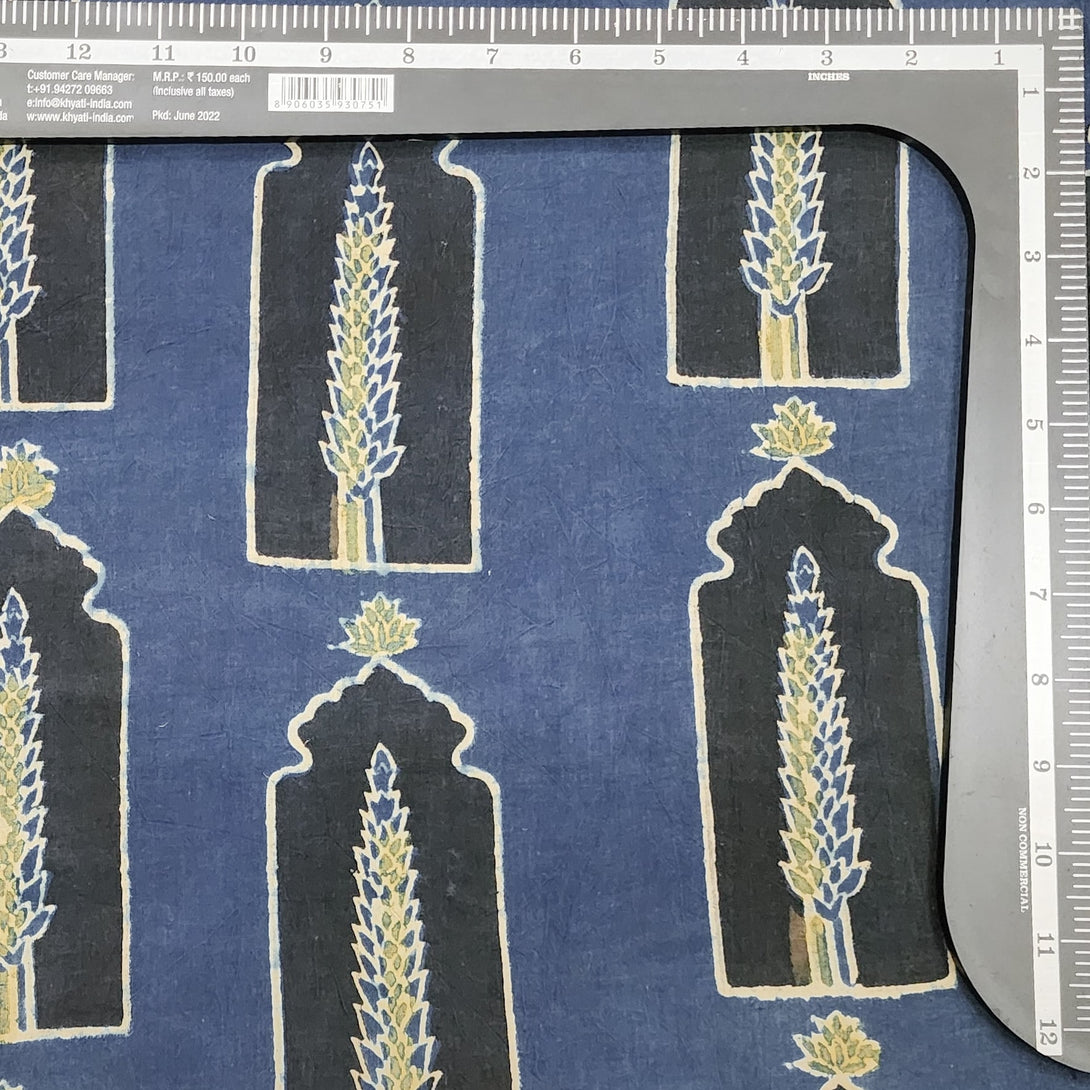 Pure Cotton Ajrak Blue Small Window Black With Green Leave Motif Hand Block Print Fabric