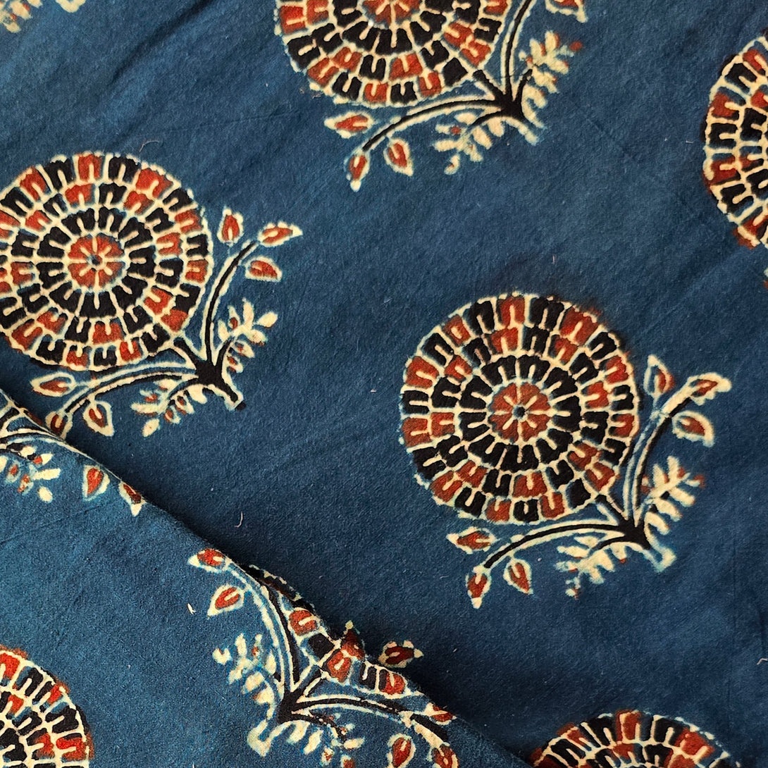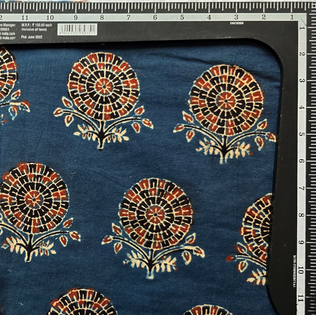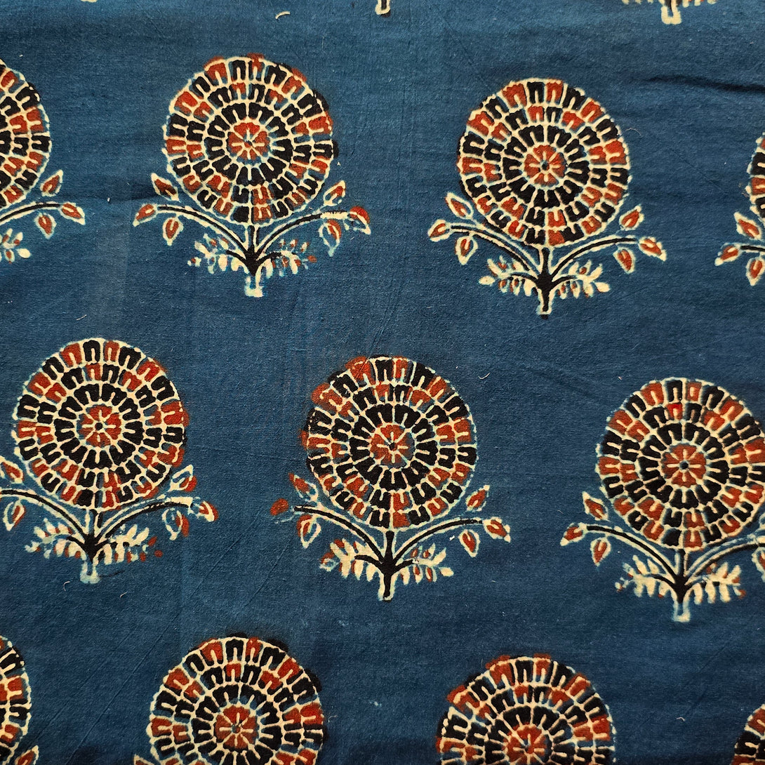 Pure Cotton Ajrak Blue With Big Flower Motif Hand Block Print Fabric