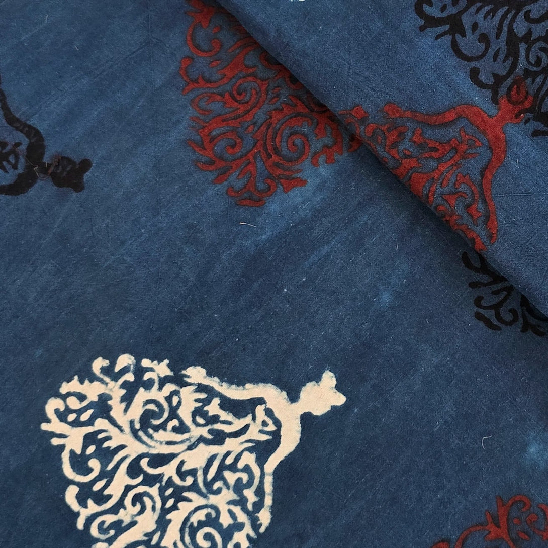 Pure Cotton Ajrak Blue With Cream And Black Doll Motif Hand Block Print Fabric