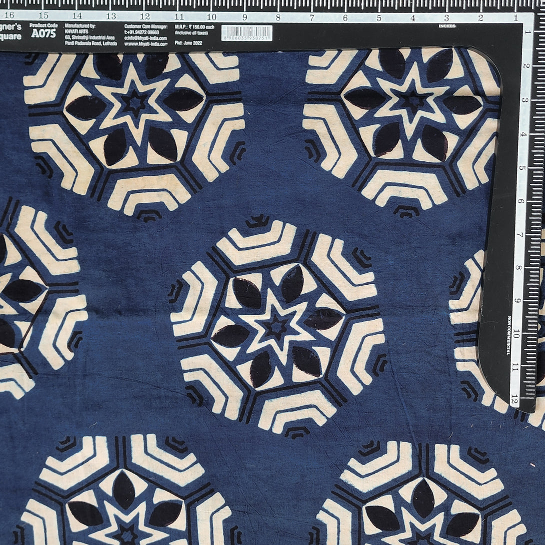 Pure Cotton Ajrak Blue With Cream Big Geometrical With Intricate Design Hand Block Print Fabric