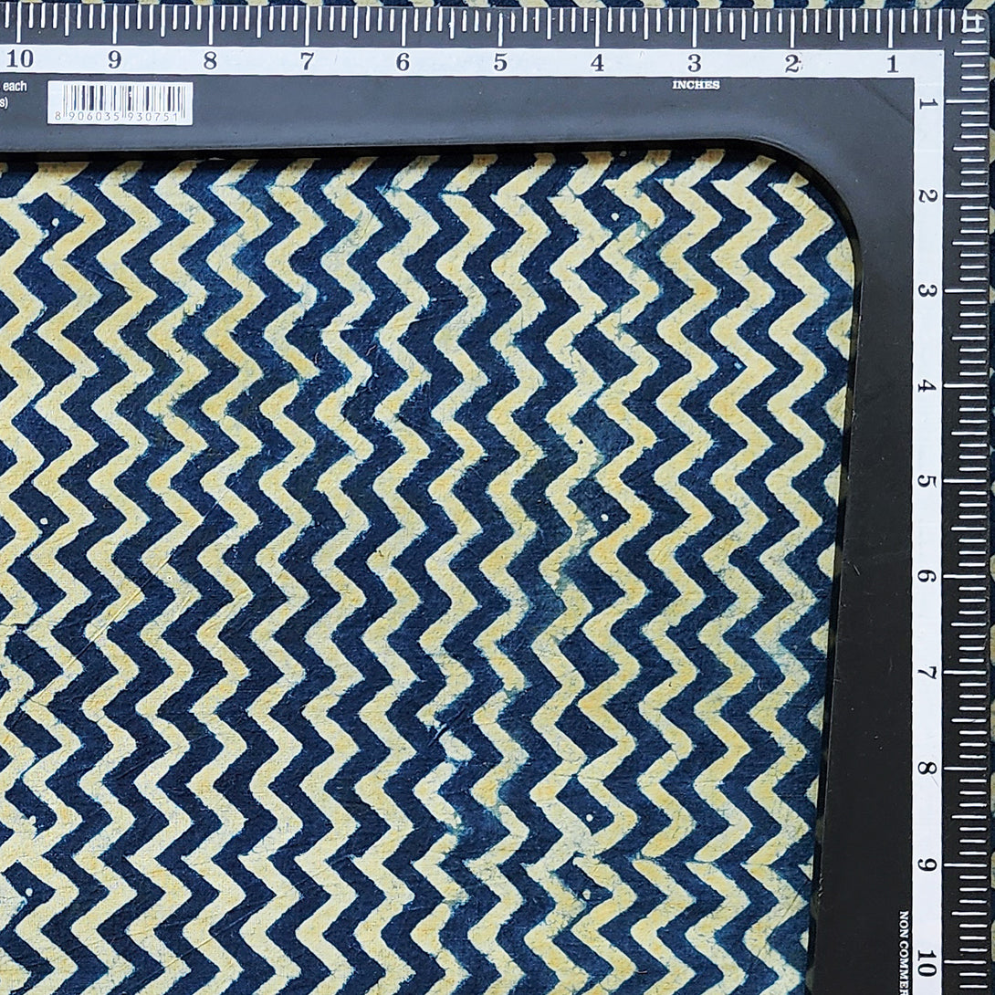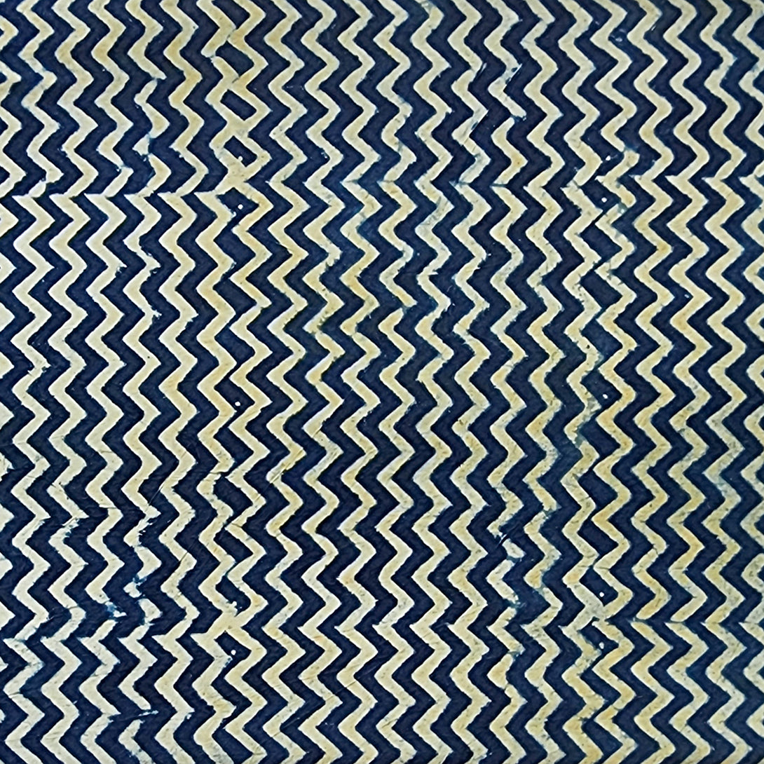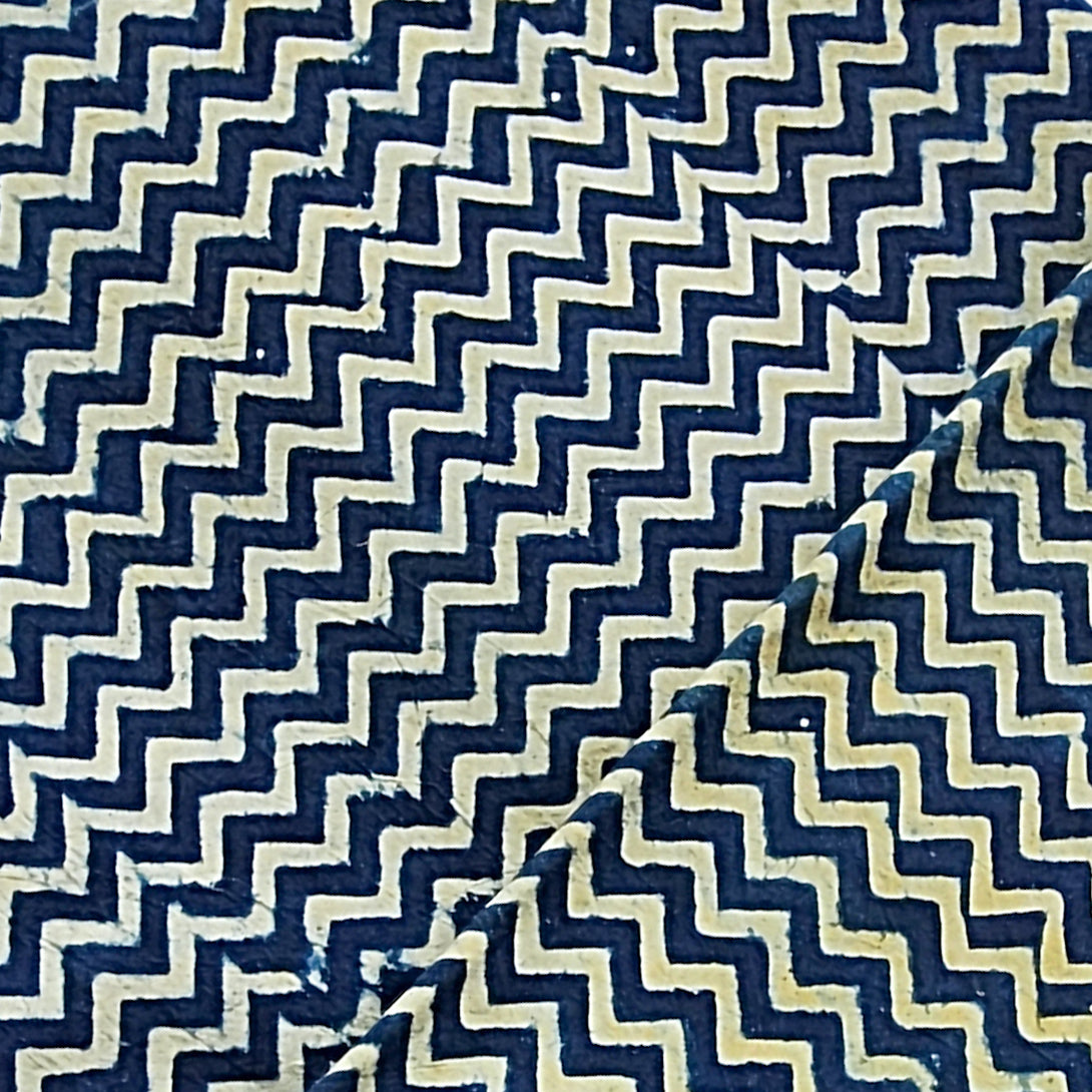 Pure Cotton Ajrak Blue With Greenish Cream Zig-Zag Hand Block Print Fabric