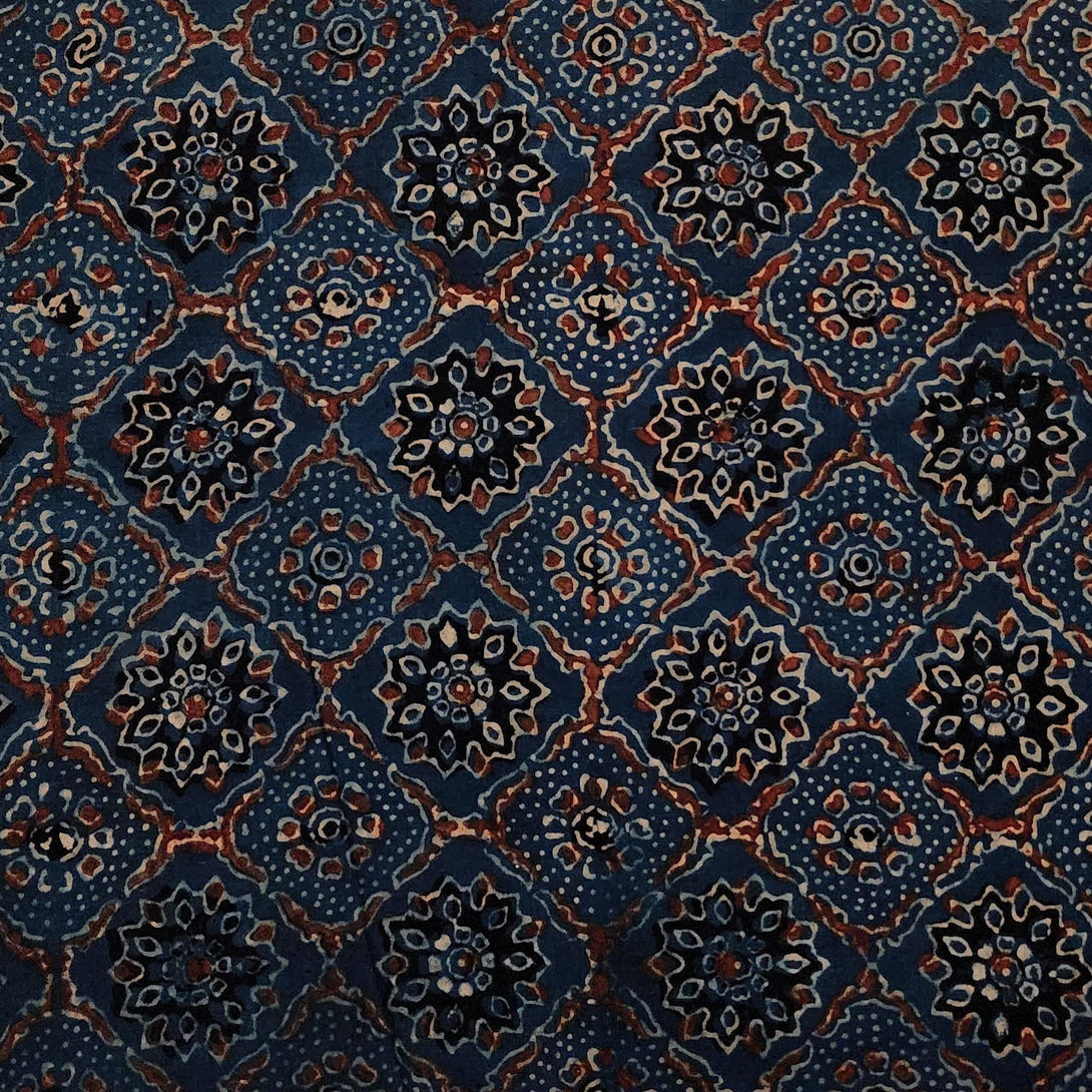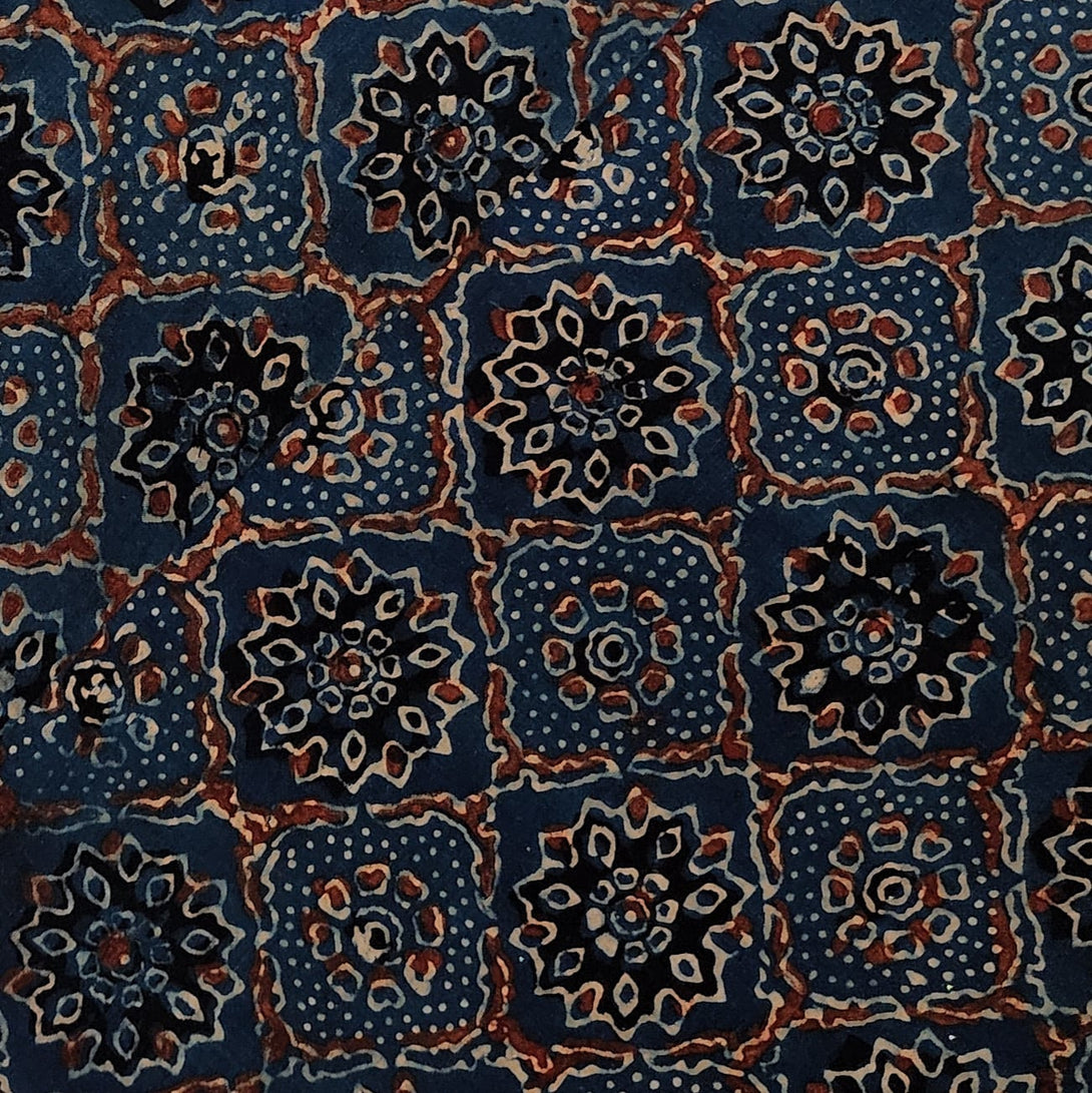 Pure Cotton Ajrak Blue With Diagonal Mesh Flowers Motifs Hand Block Print Fabric
