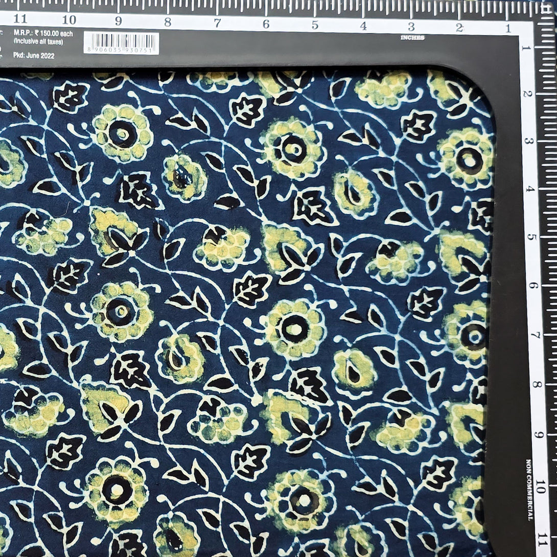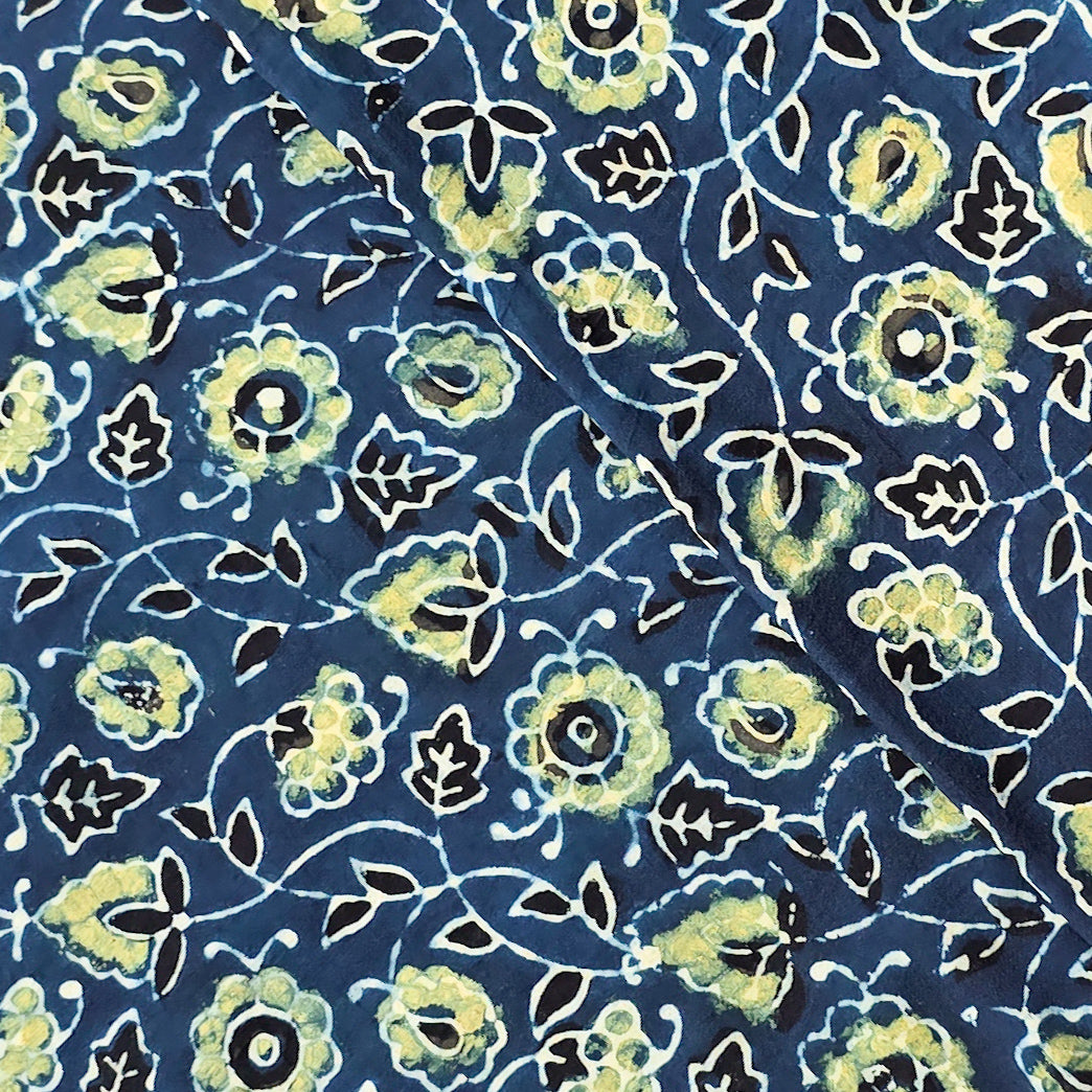 Pure Cotton Ajrak Blue With Green Flower Jaal Hand Block Print Fabric