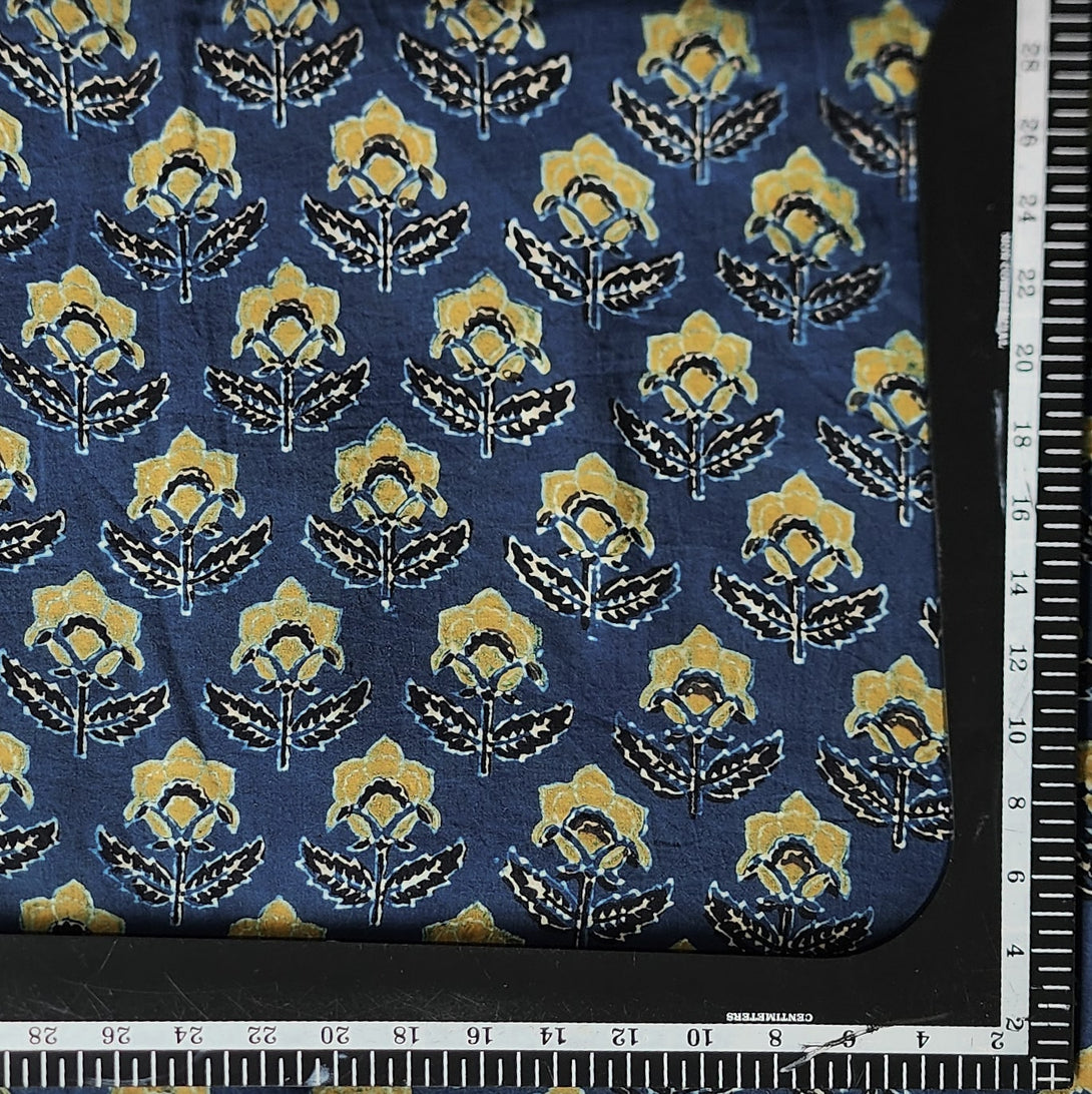 Pure Cotton Double Ajrak Blue With Green Flower Motif Hand Block Print Fabric