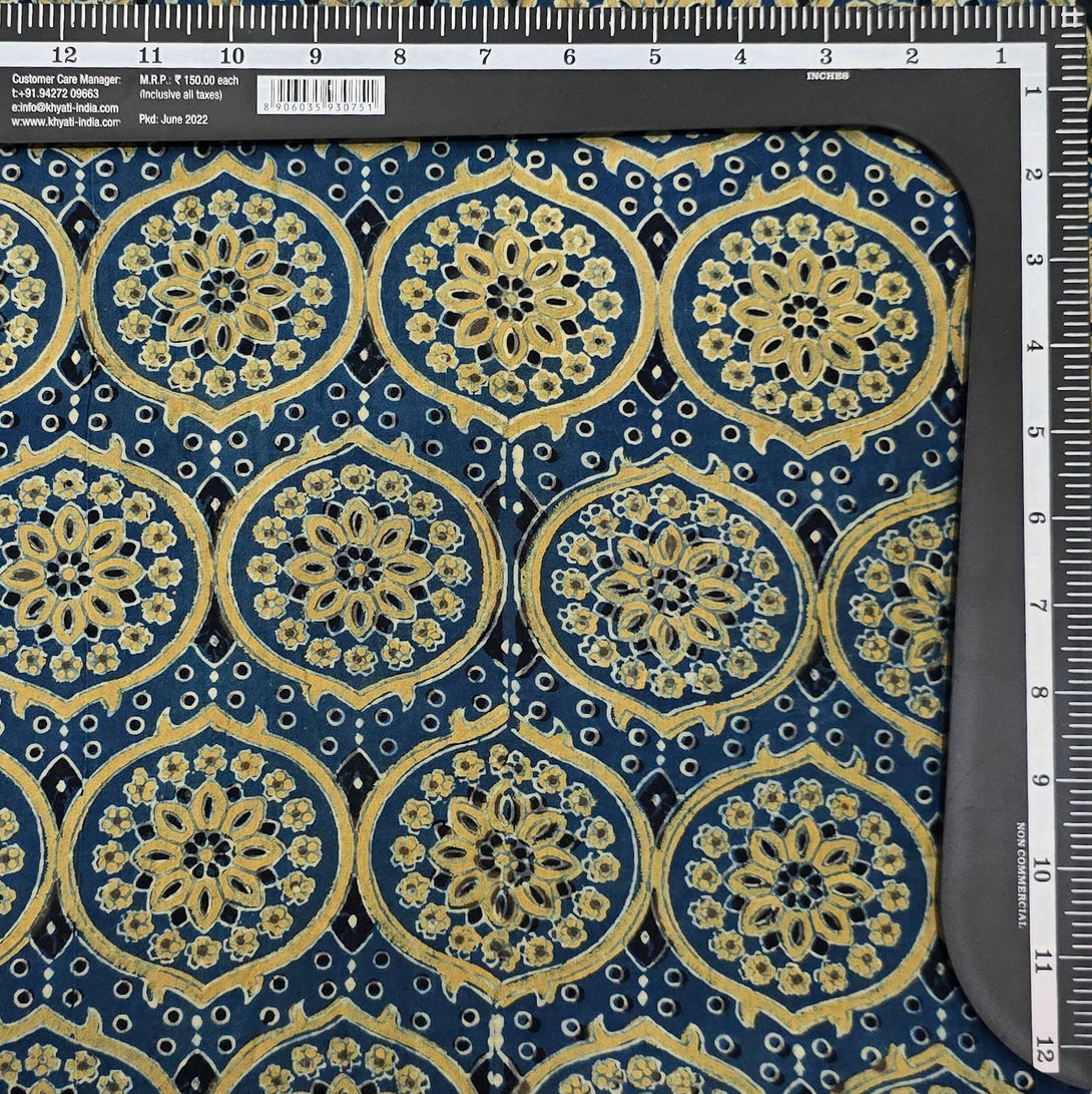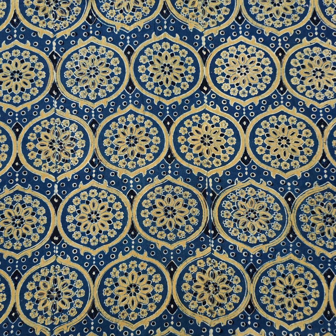 Pure Cotton Ajrak Blue With Green Intricate Design Motif Hand Block Print Fabric