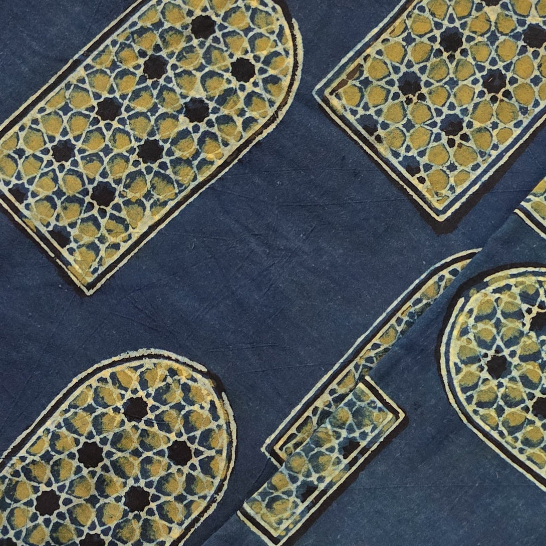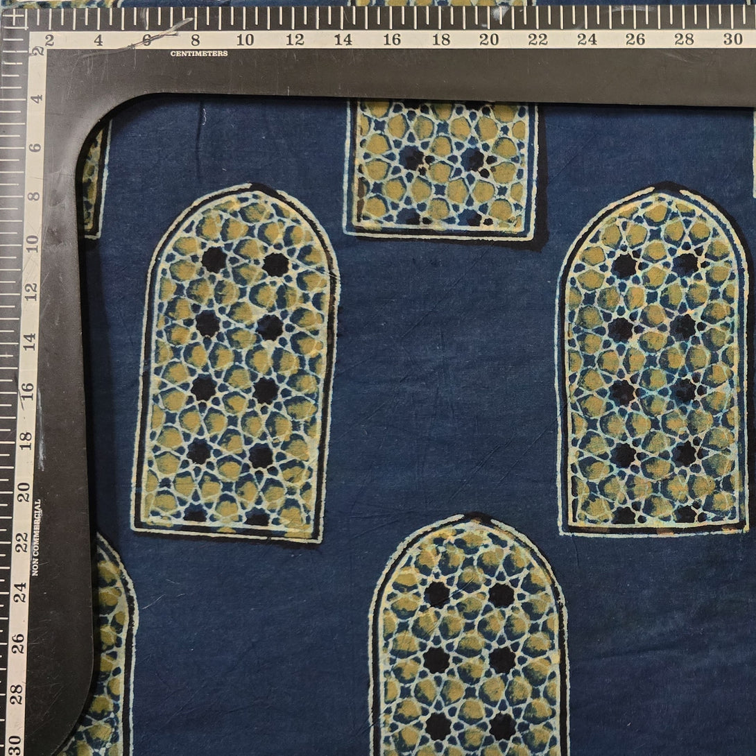 Pure Cotton Ajrak Blue With Green Window Hand Block Print Fabric