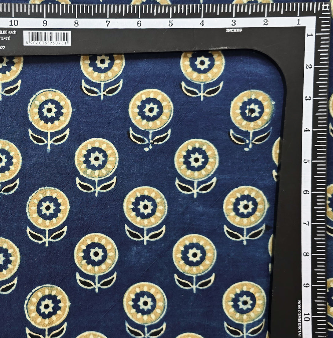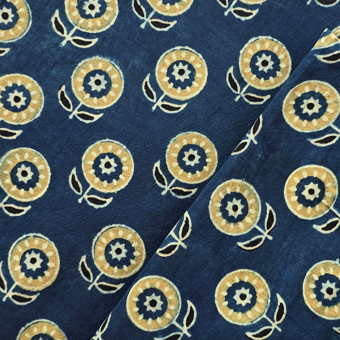 Pure Cotton Gad Ajrak Blue With Mustard Flower Motif Hand Block Print Fabric