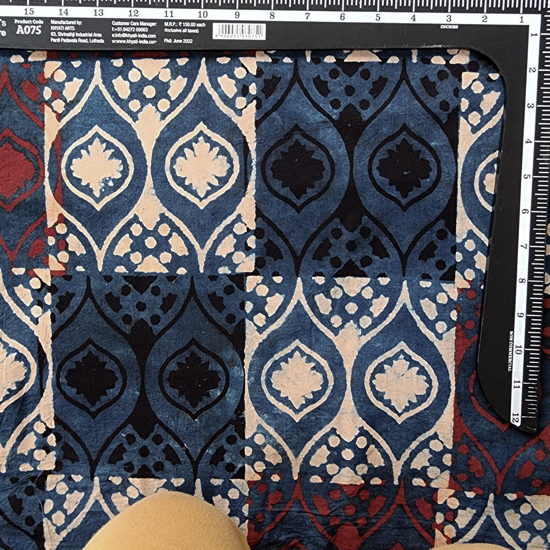 Pure Cotton Ajrak Blue With Red And Cream Intricate Design Tile Hand Block Print Fabric