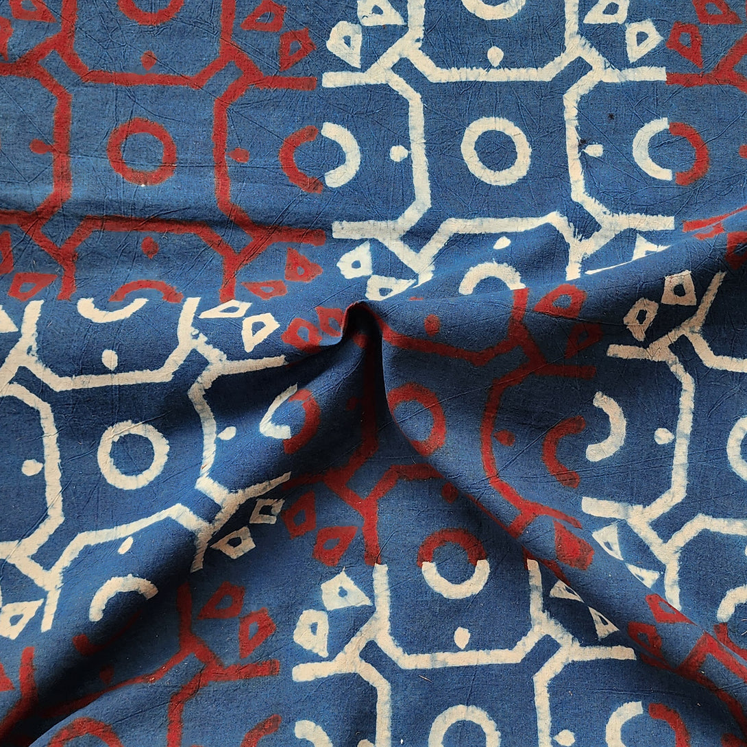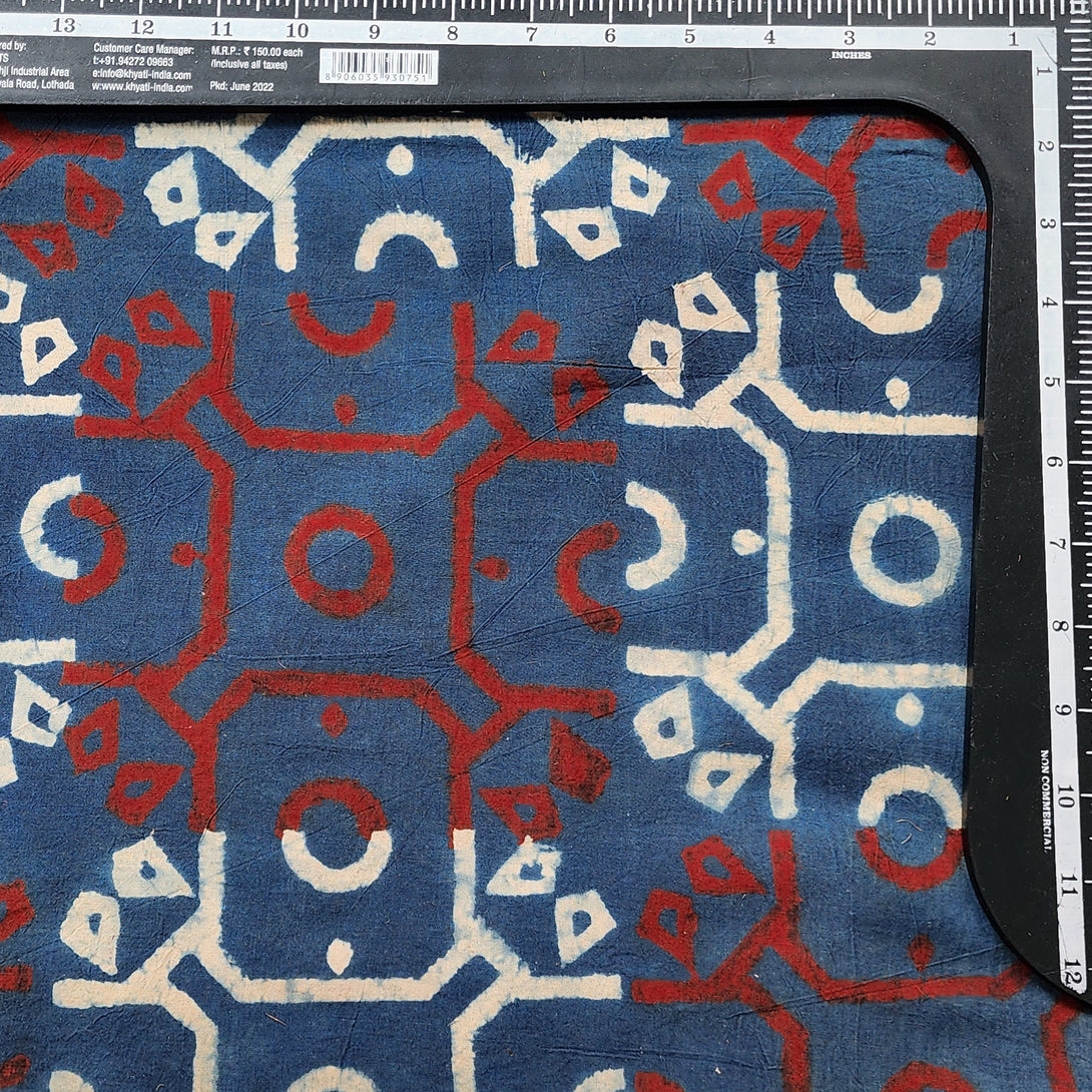 Pure Cotton Ajrak Blue With Red And Off White Tiles Design Hand Block Print Fabric