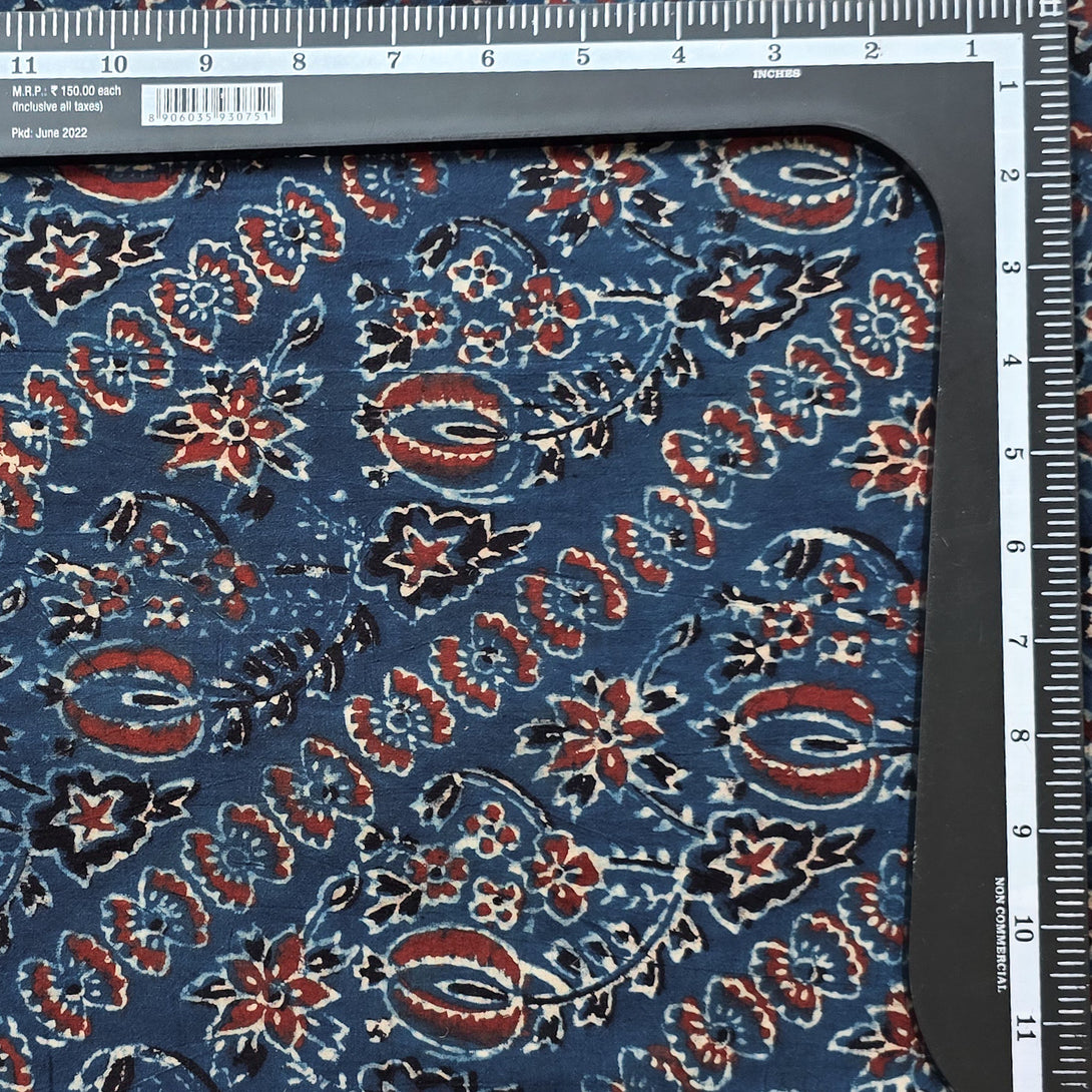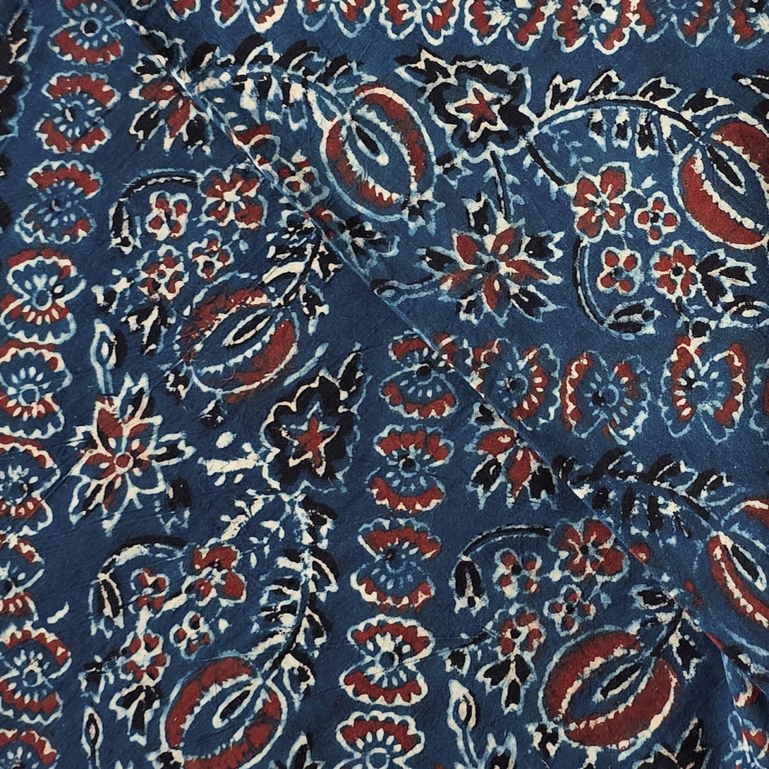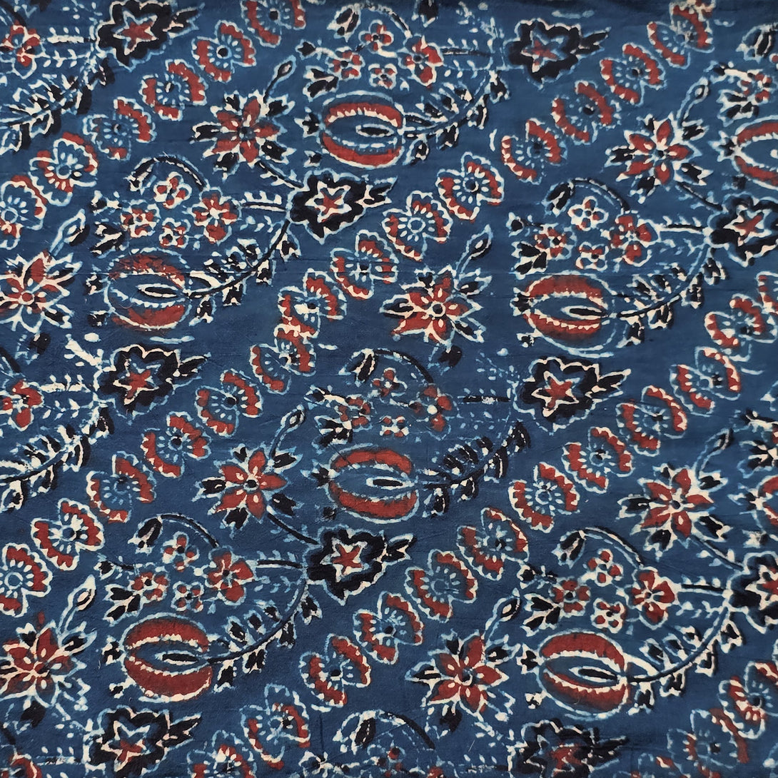 Pure Cotton Ajrak Blue With Red Fruit And Flower Jaal Hand Block Print Fabric