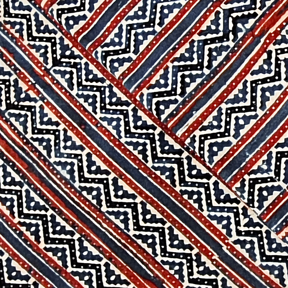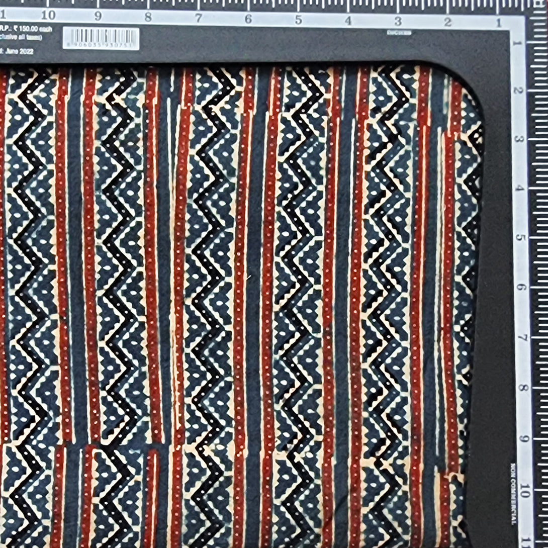 Pure Cotton Ajrak Blue With Red Zig Zag Border Stripes Hand Block Print Fabric