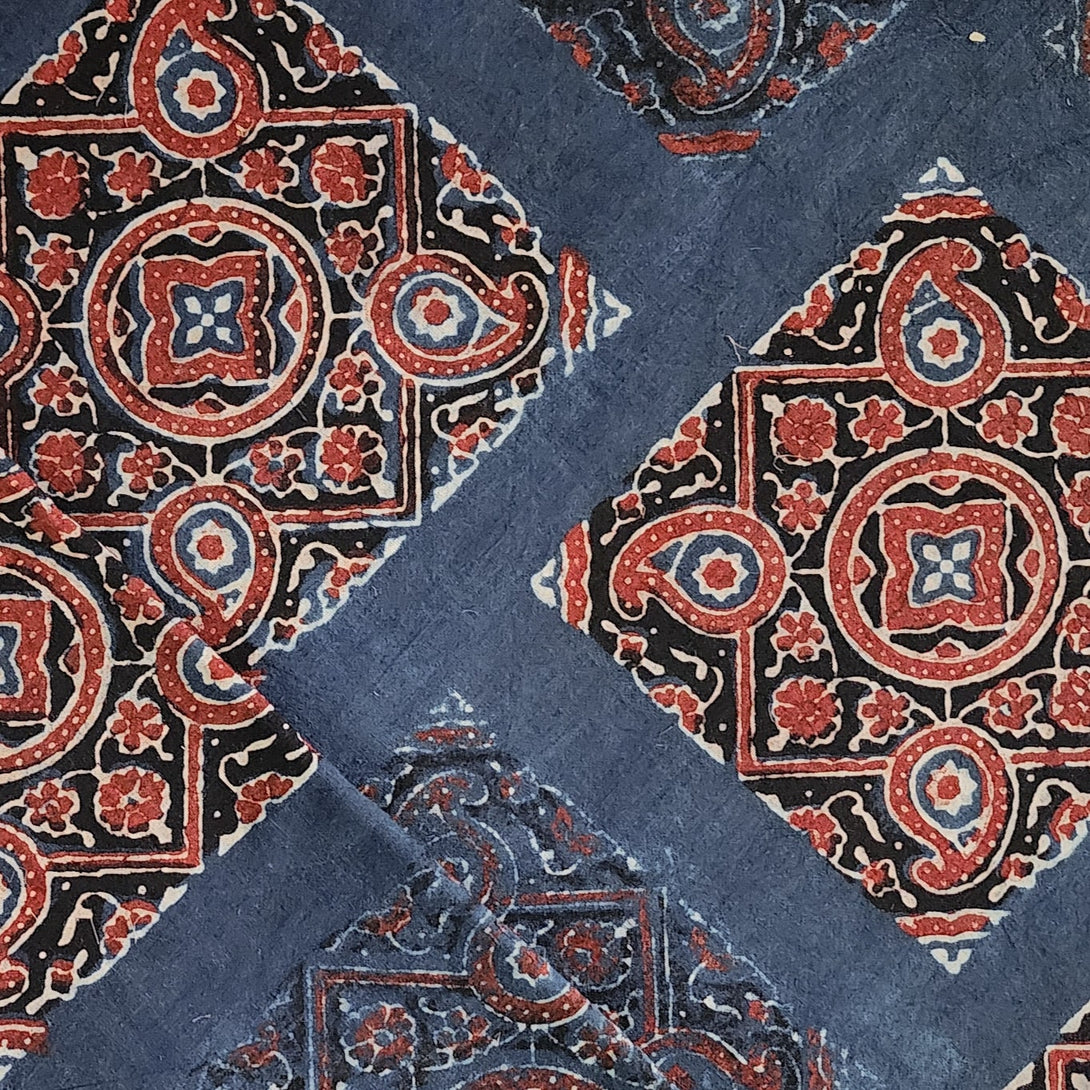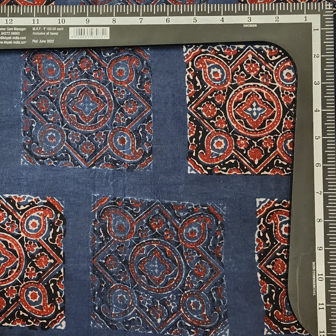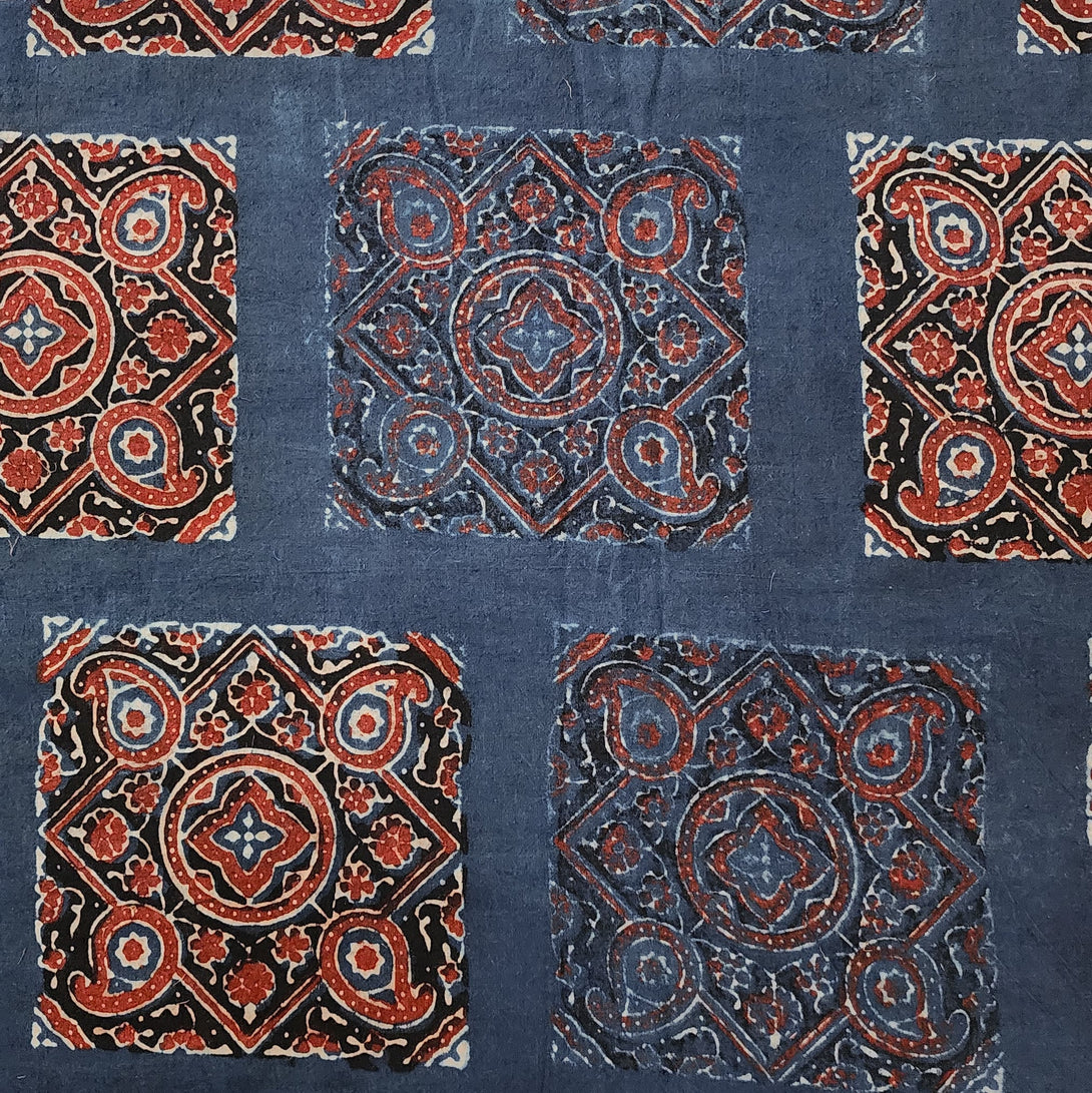Pure Cotton Ajrak Blue With Rust Red Square Intricate Design Hand Block Print Fabric