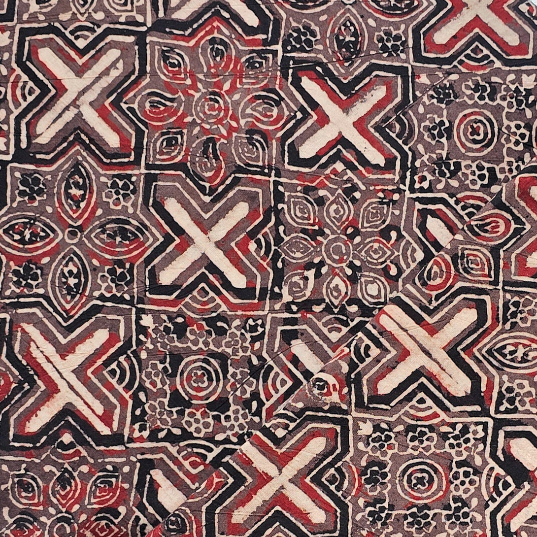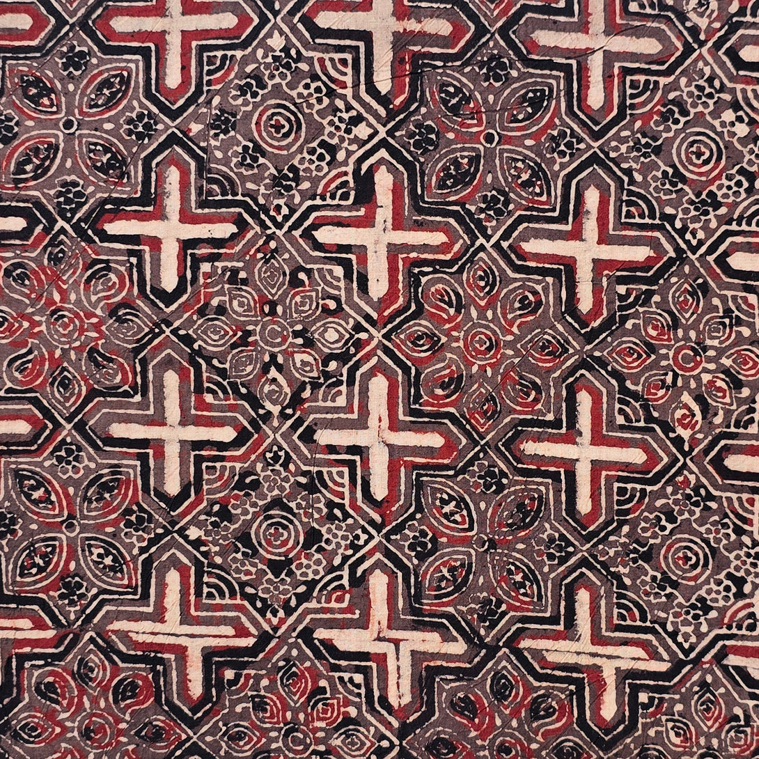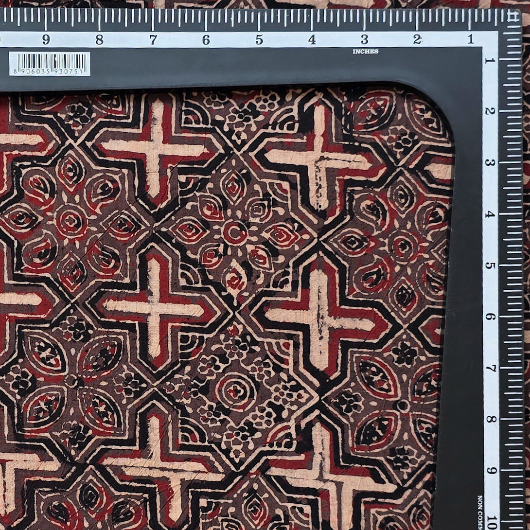 Pure Cotton Ajrak Brown With Crem Plus And Intricate Design Hand Block Print Fabric
