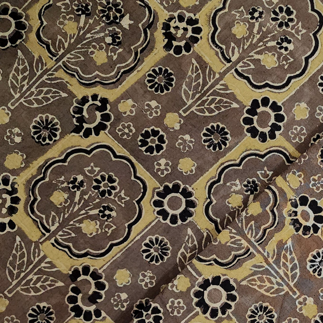 Pure Cotton Ajrak Brown With Squares And Floral Plants Motifs Hand Block Print Fabric